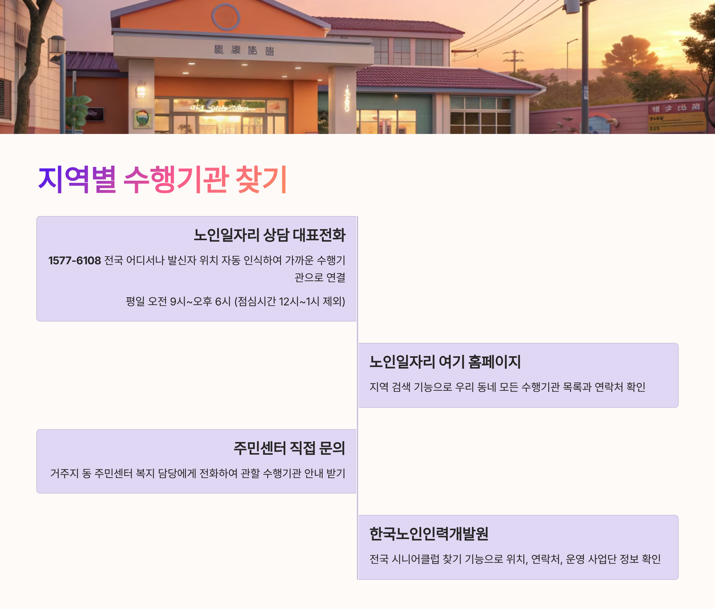노인일자리 여기 홈페이지에서 검색 홈페이지에 접속하여 지역 검색 기능을 이용하면 우리 동네 모든 수행기관 목록과 연락처가 한 번에 나옵니다. 시니어클럽, 노인복지관, 대한노인회 지회 등이 표시됩니다.