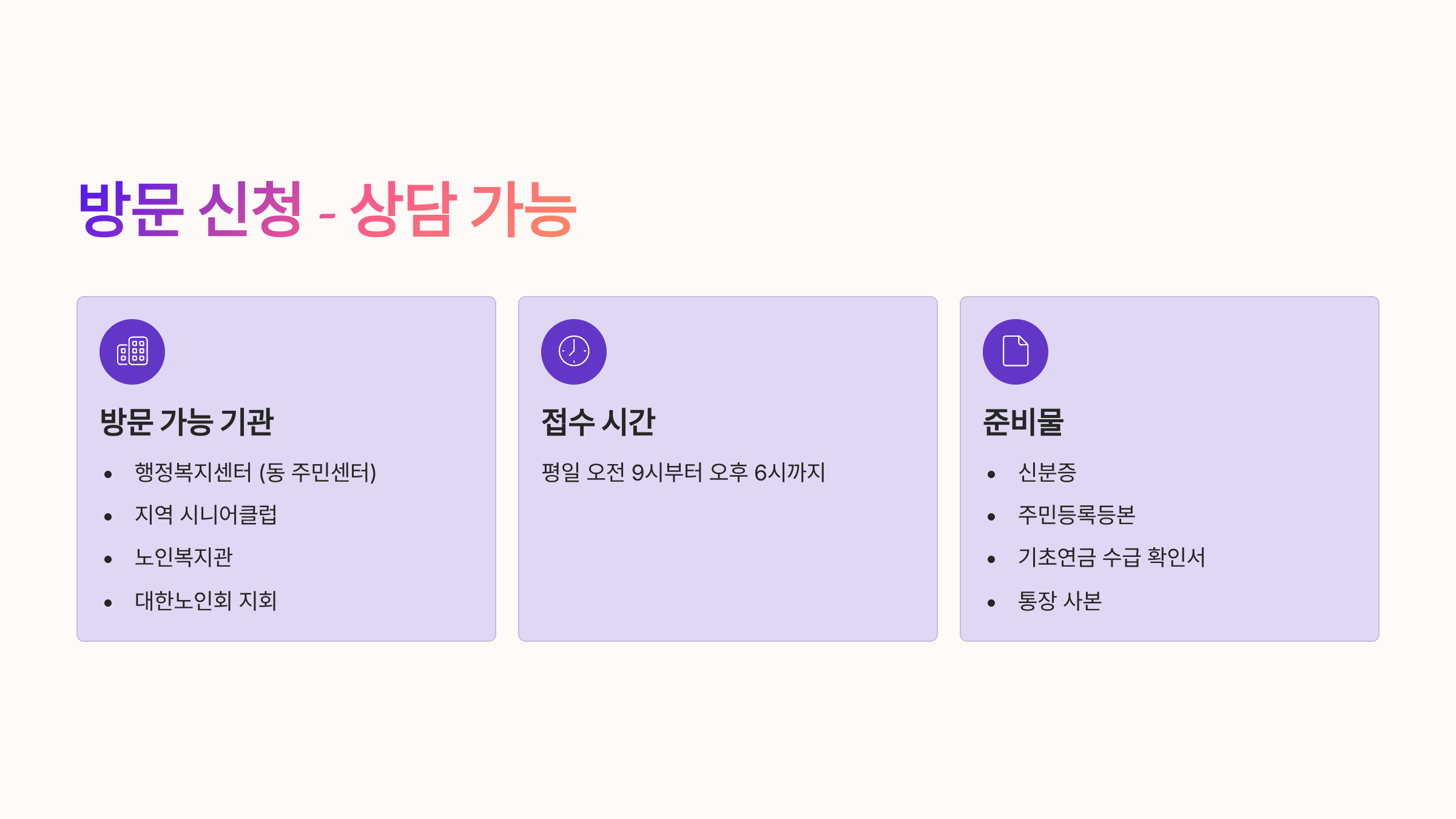 접수 시간: 평일 오전 9시부터 오후 6시까지 준비물: 신분증, 주민등록등본, 기초연금 수급 확인서, 통장 사본