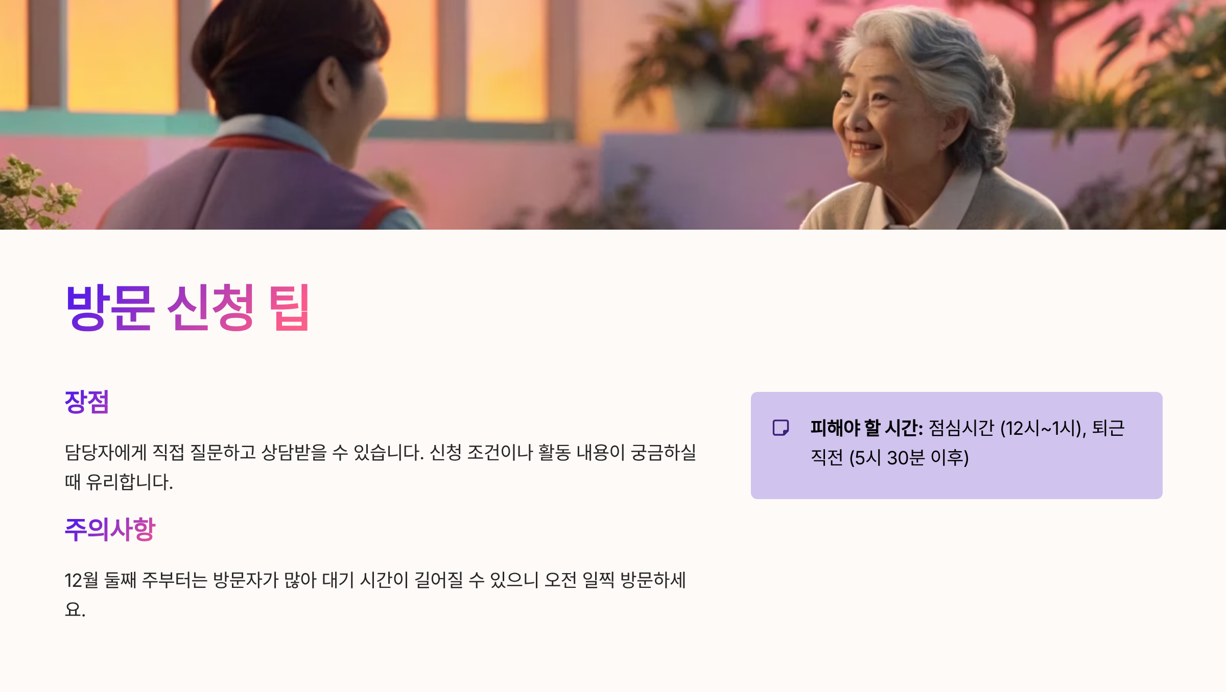 방문 신청은 담당자에게 직접 질문하고 상담받을 수 있다는 장점이 있습니다. 신청 조건이나 활동 내용이 궁금하실 때는 방문 신청이 더 유리해요. 다만 12월 둘째 주부터는 방문자가 많아 대기 시간이 길어질 수 있으니 오전 일찍 방문하시는 것을 추천드립니다.
