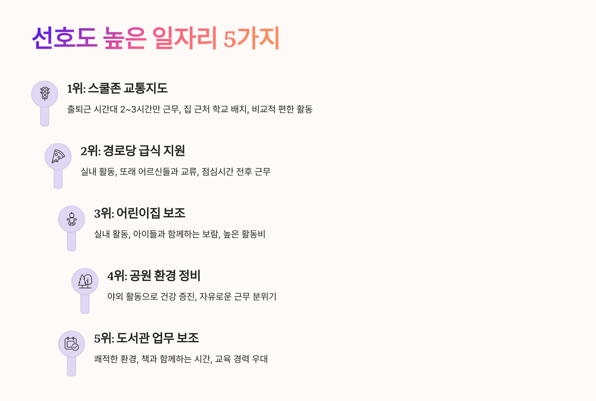 1위: 스쿨존 교통지도 (공익활동형) 출퇴근 시간대 2~3시간만 근무, 집 근처 학교 배치, 비교적 편한 활동