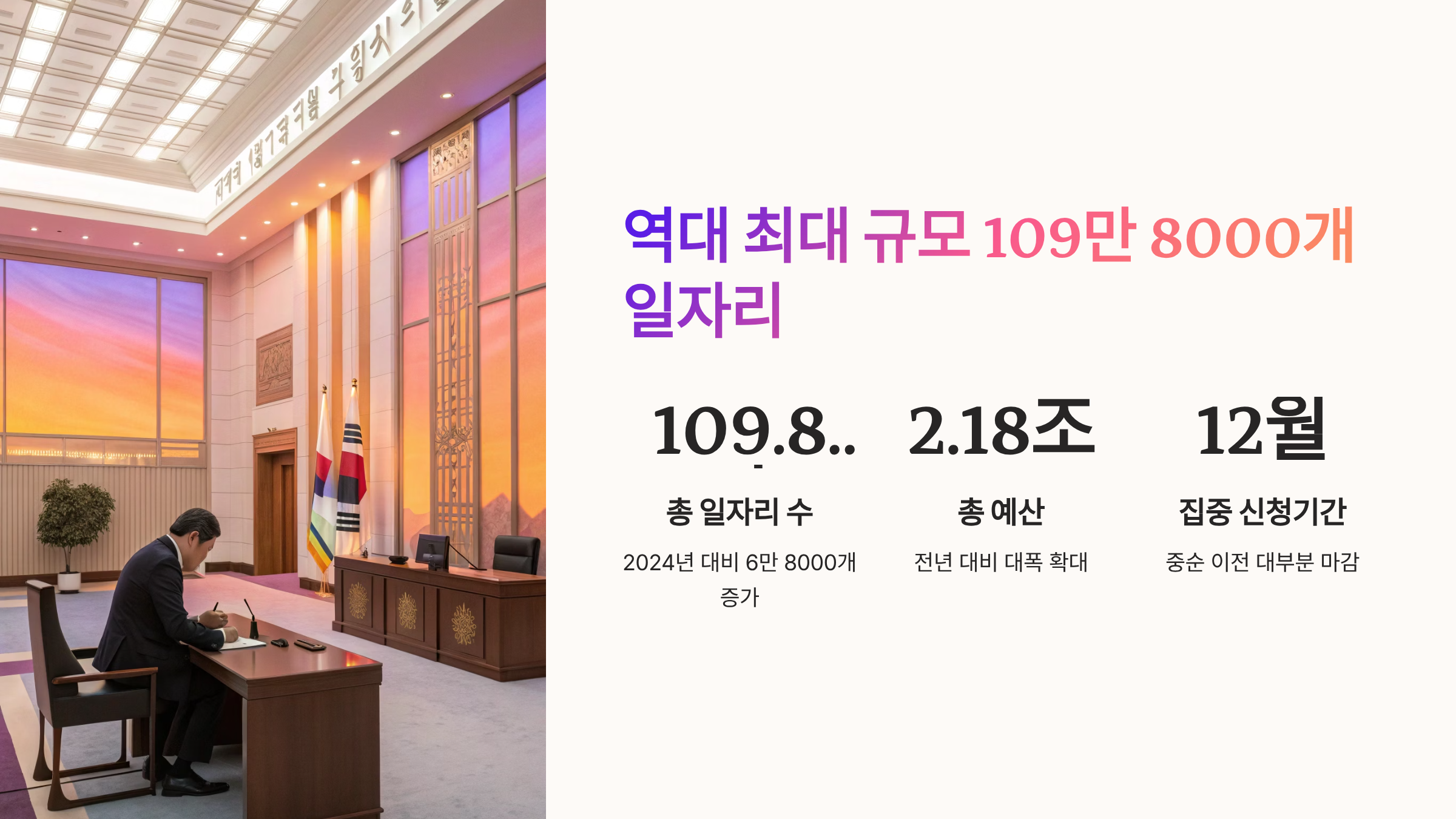 보건복지부는 2025년 역대 최대 규모인 109만 8000개의 일자리를 제공한다고 밝혔습니다. 작년보다 6만 8000개가 늘어난 숫자예요. 이 소중한 기회를 놓치지 마시고 12월 첫째 주부터 바로 신청하시길 바랍니다.