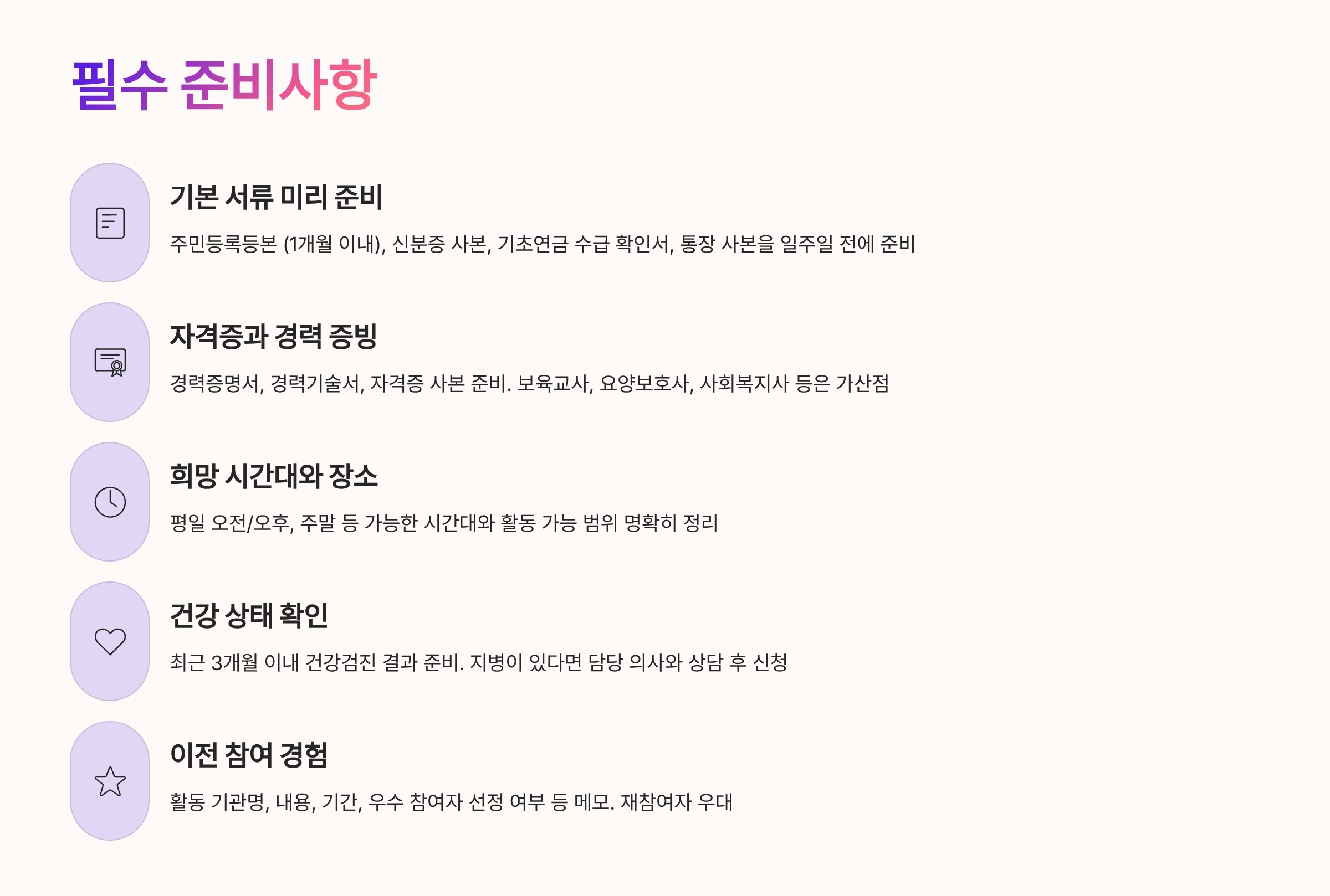 이전 참여 경험 정리 과거 노인일자리에 참여한 적이 있다면 활동 기관명, 활동 내용, 참여 기간, 우수 참여자 선정 여부 등을 간단히 메모해 가세요. 재참여자는 우대되는 경우가 많습니다.