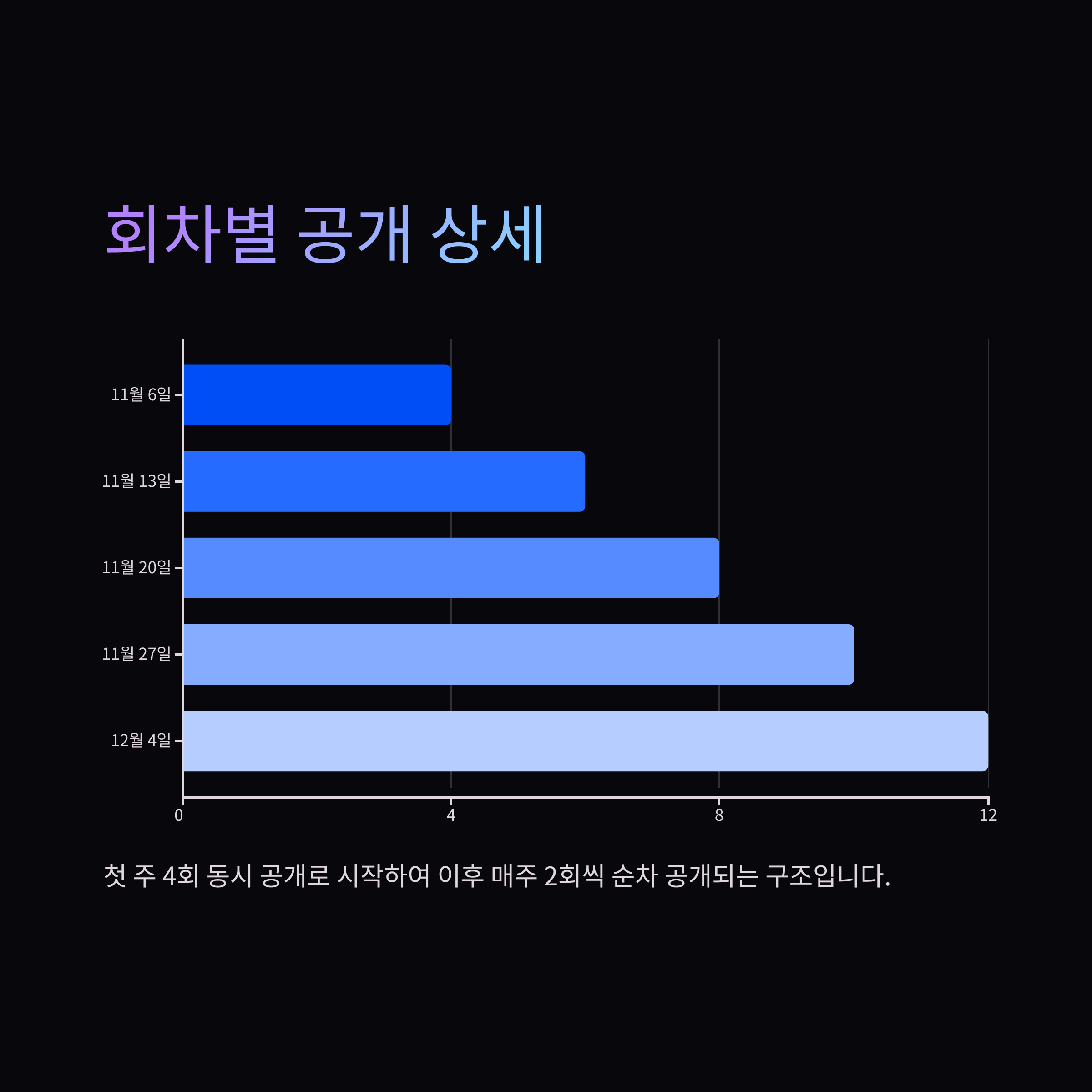 | 11월 27일 (목) | 9화~10화 | 10화 | 매주 2회 공개 |