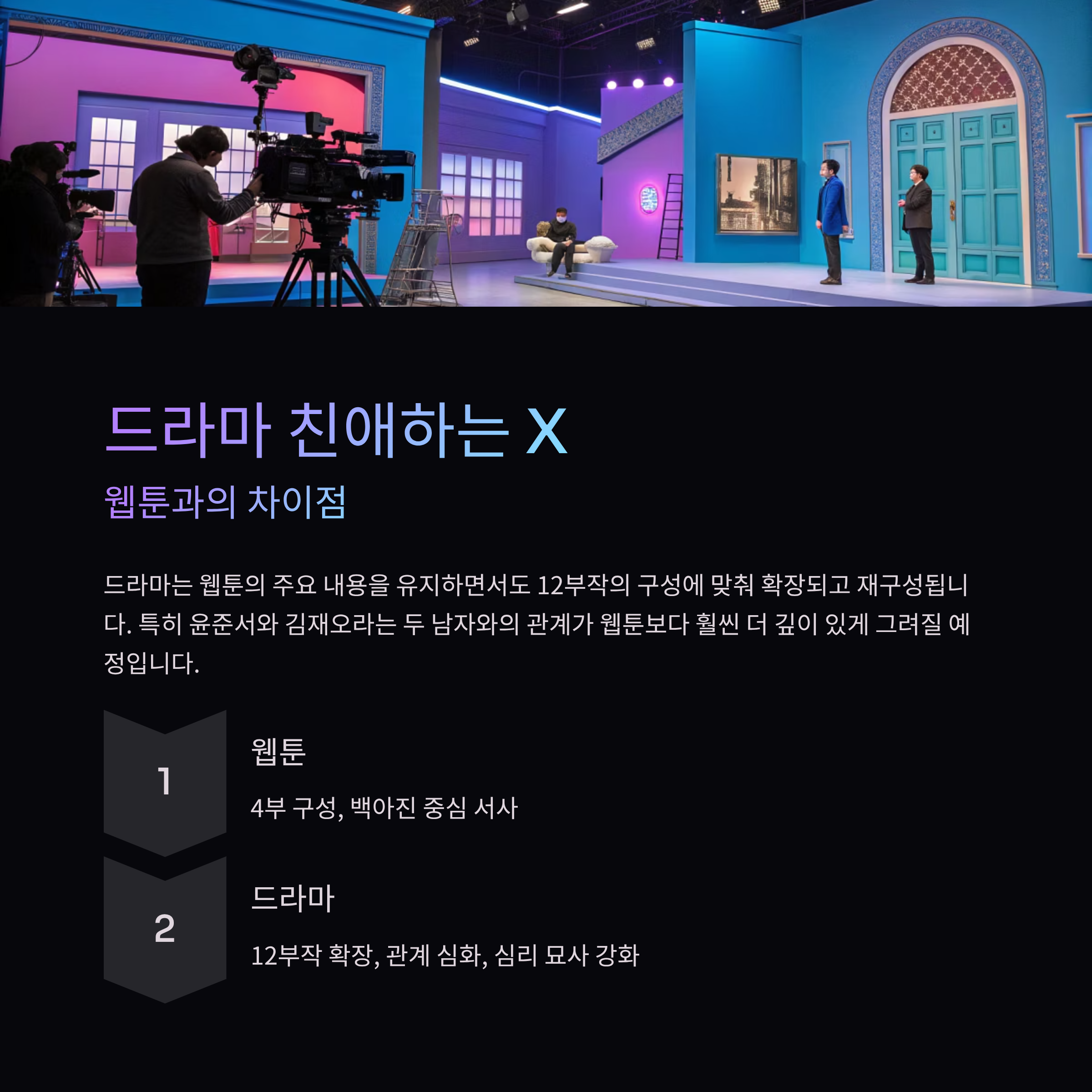 드라마는 웹툰의 주요 내용을 유지하면서도 12부작의 구성에 맞춰 확장되고 재구성됩니다. 특히 윤준서와 김재오라는 두 남자와의 관계가 웹툰보다 훨씬 더 깊이 있게 그려질 예정입니다.