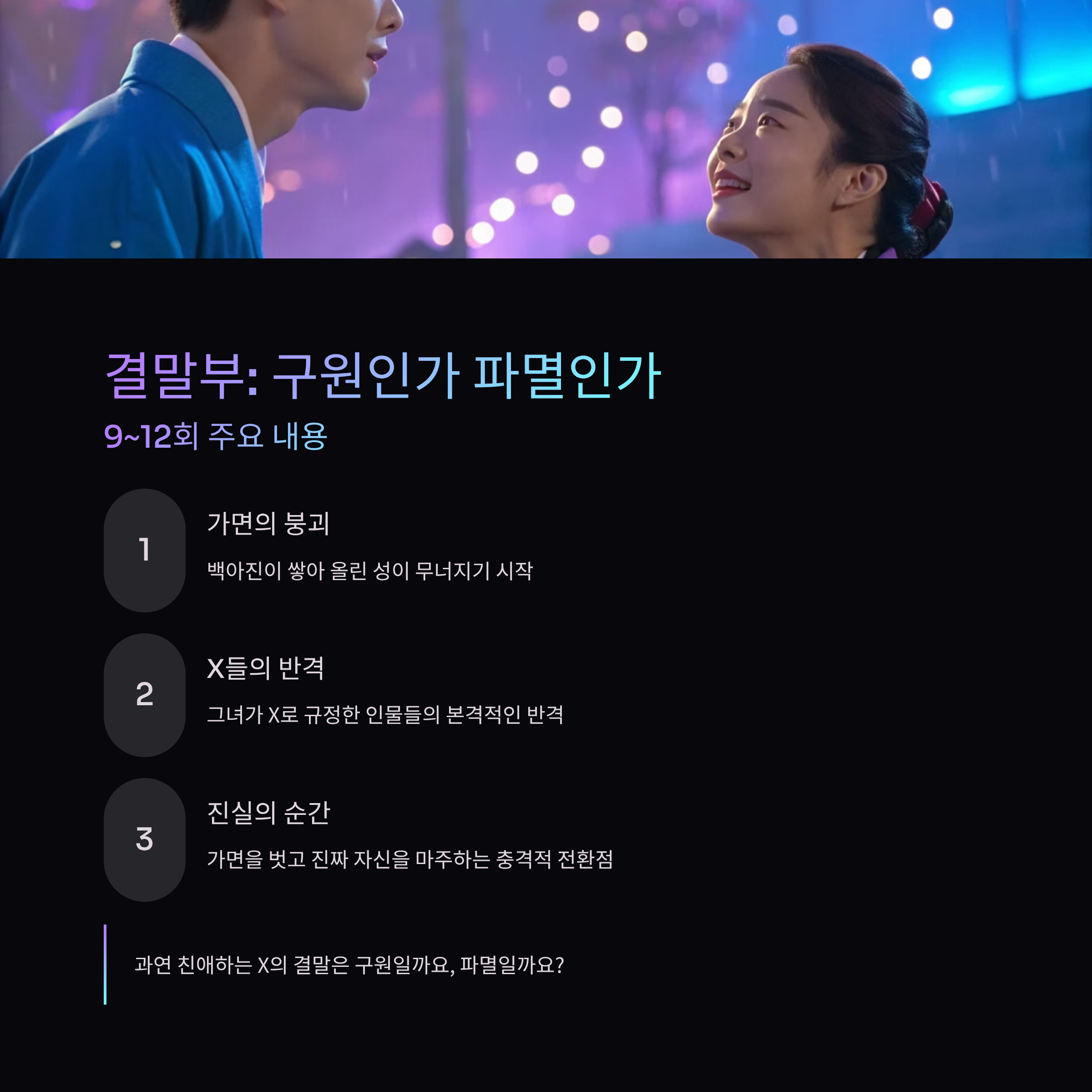 백아진이 쌓아 올린 가면의 성이 무너지기 시작합니다. 그녀가 X로 규정한 인물들의 반격, 그리고 백아진이 가면을 벗고 진짜 자신을 마주하는 충격적인 전환점. 과연 친애하는 X의 결말은 구원일까요, 파멸일까요?