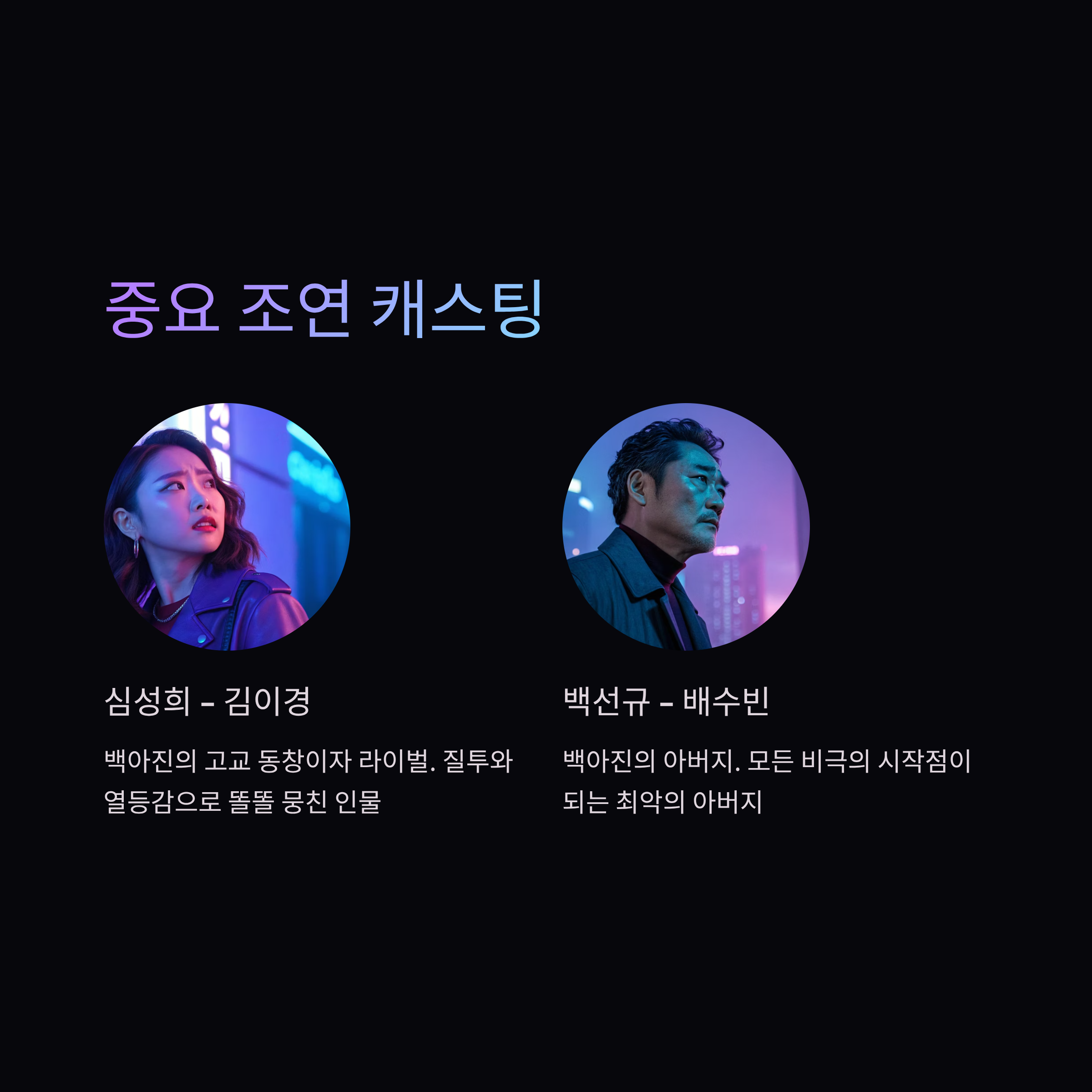 백아진의 고교 동창이자 라이벌. 질투와 열등감으로 똘똘 뭉친 인물로, 백아진에 대한 독기 품은 눈빛으로 긴장감을 조성합니다.