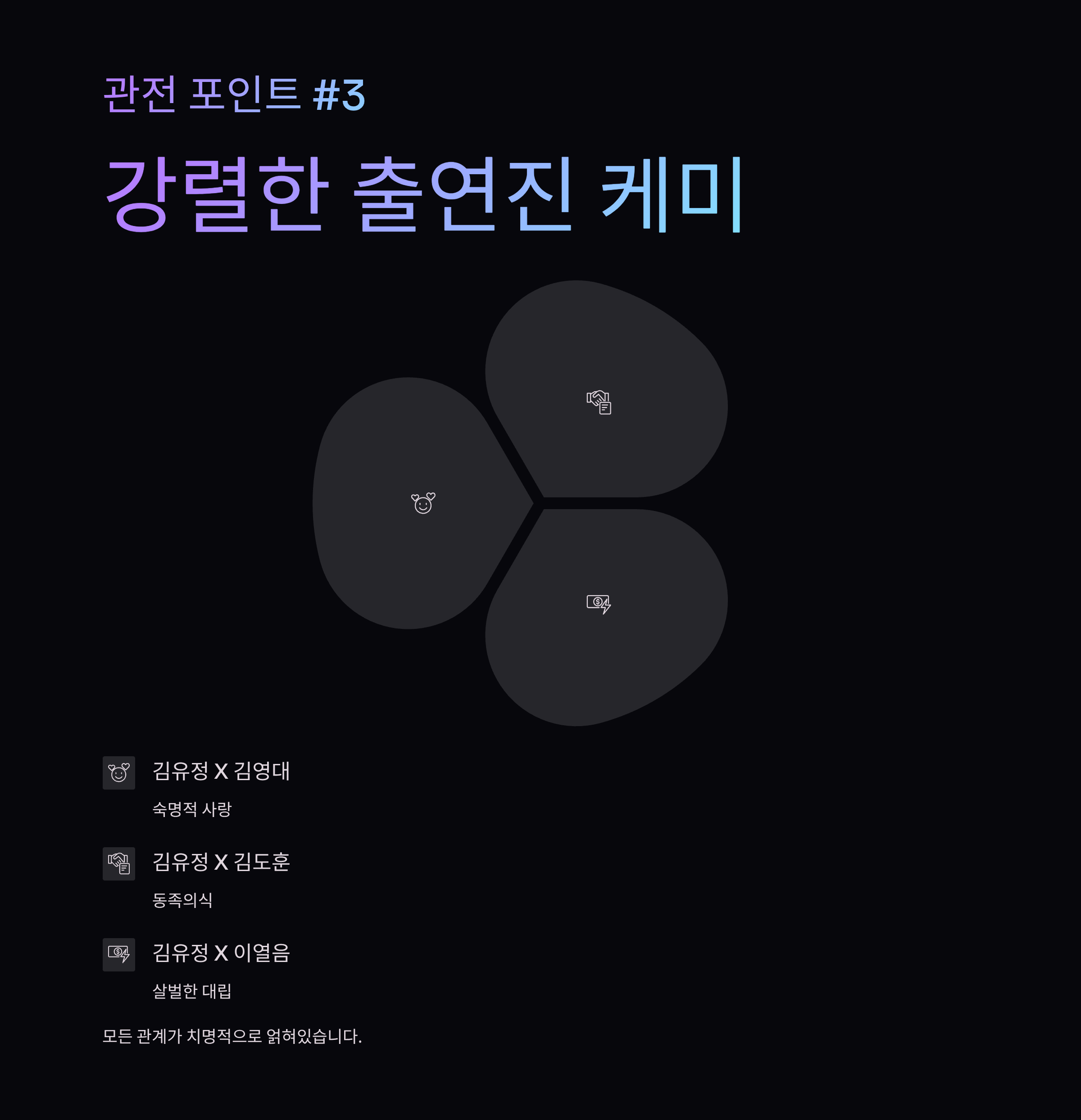 김유정X김영대의 숙명적 사랑, 김유정X김도훈의 동족의식, 김유정X이열음의 살벌한 대립. 모든 관계가 치명적으로 얽혀있습니다.
