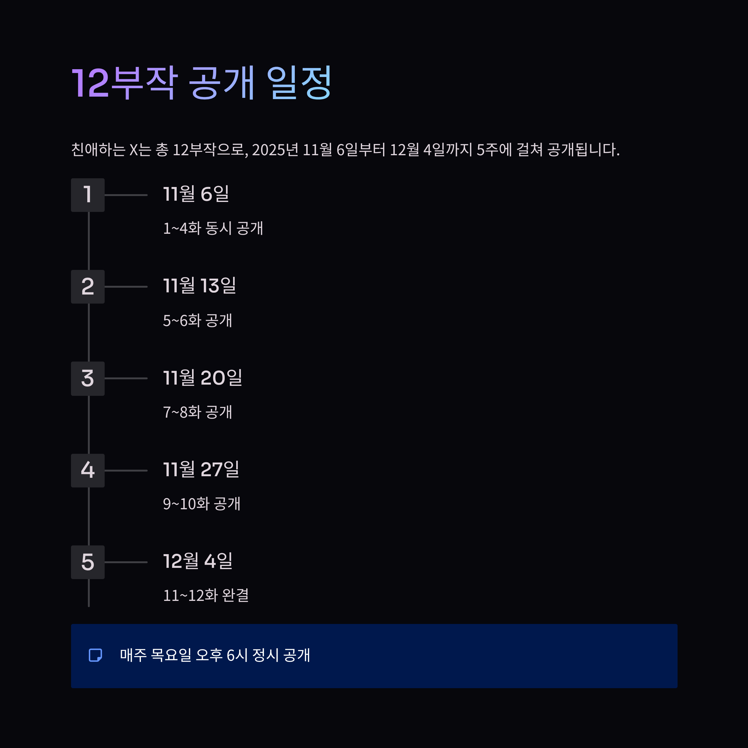 친애하는 X는 총 12부작으로, 2025년 11월 6일부터 12월 4일까지 5주에 걸쳐 공개됩니다.