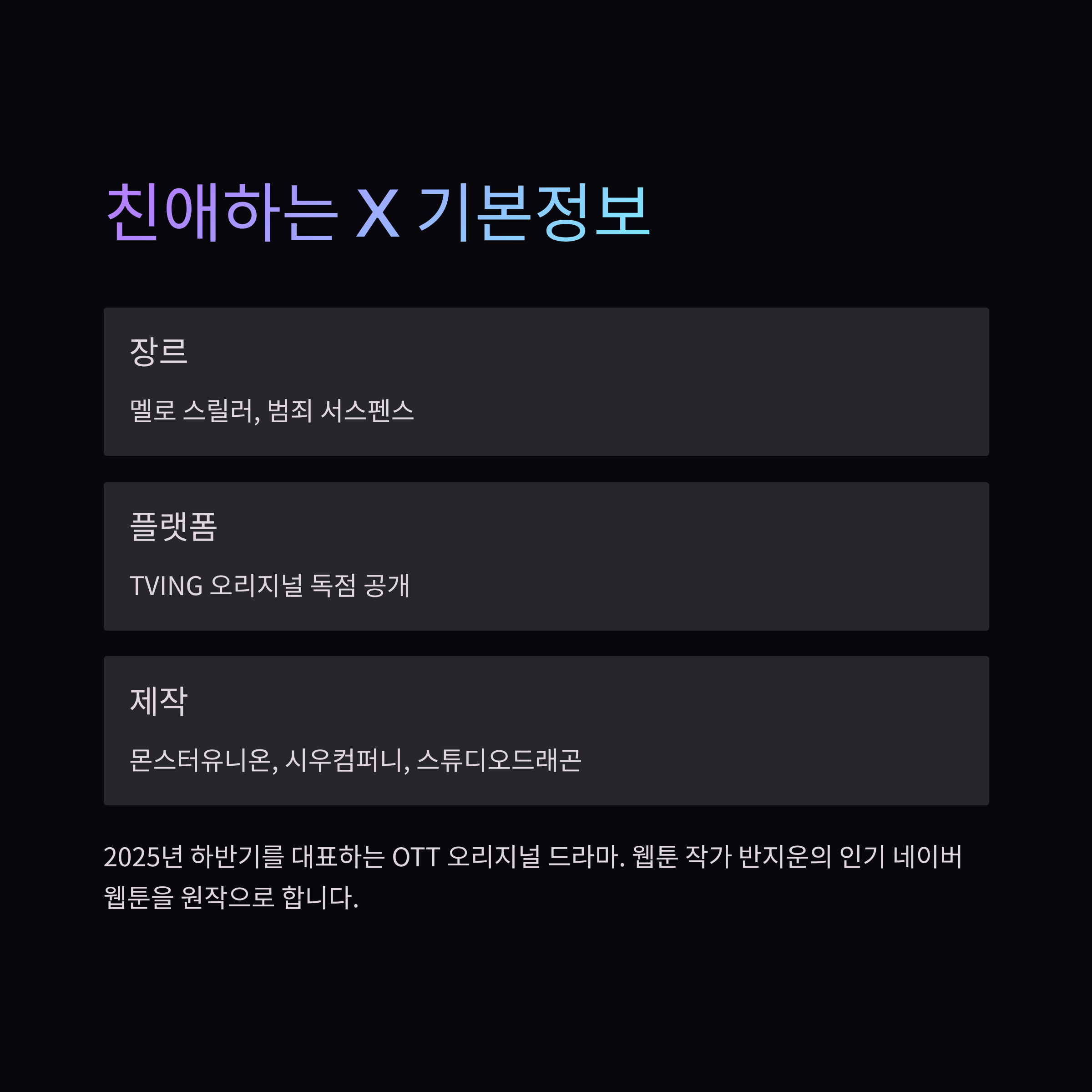 친애하는 X는 2025년 하반기를 대표하는 OTT 오리지널 드라마입니다. 웹툰 작가 반지운의 인기 네이버 웹툰을 원작으로 하며, TVING(티빙)에서 독점 공개됩니다.
