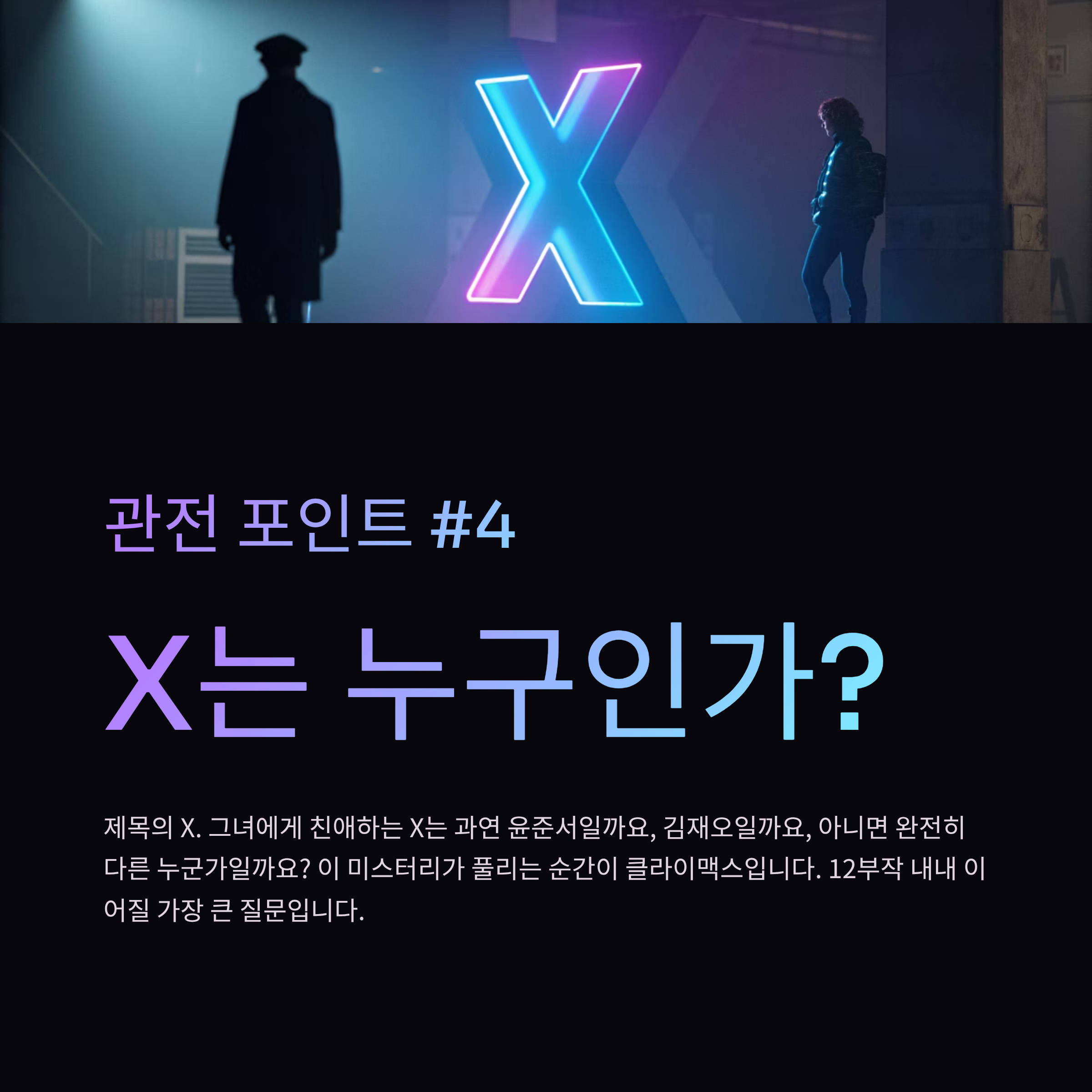 제목의 X. 그녀에게 친애하는 X는 과연 윤준서일까요, 김재오일까요, 아니면 완전히 다른 누군가일까요? 이 미스터리가 풀리는 순간이 클라이맥스입니다.