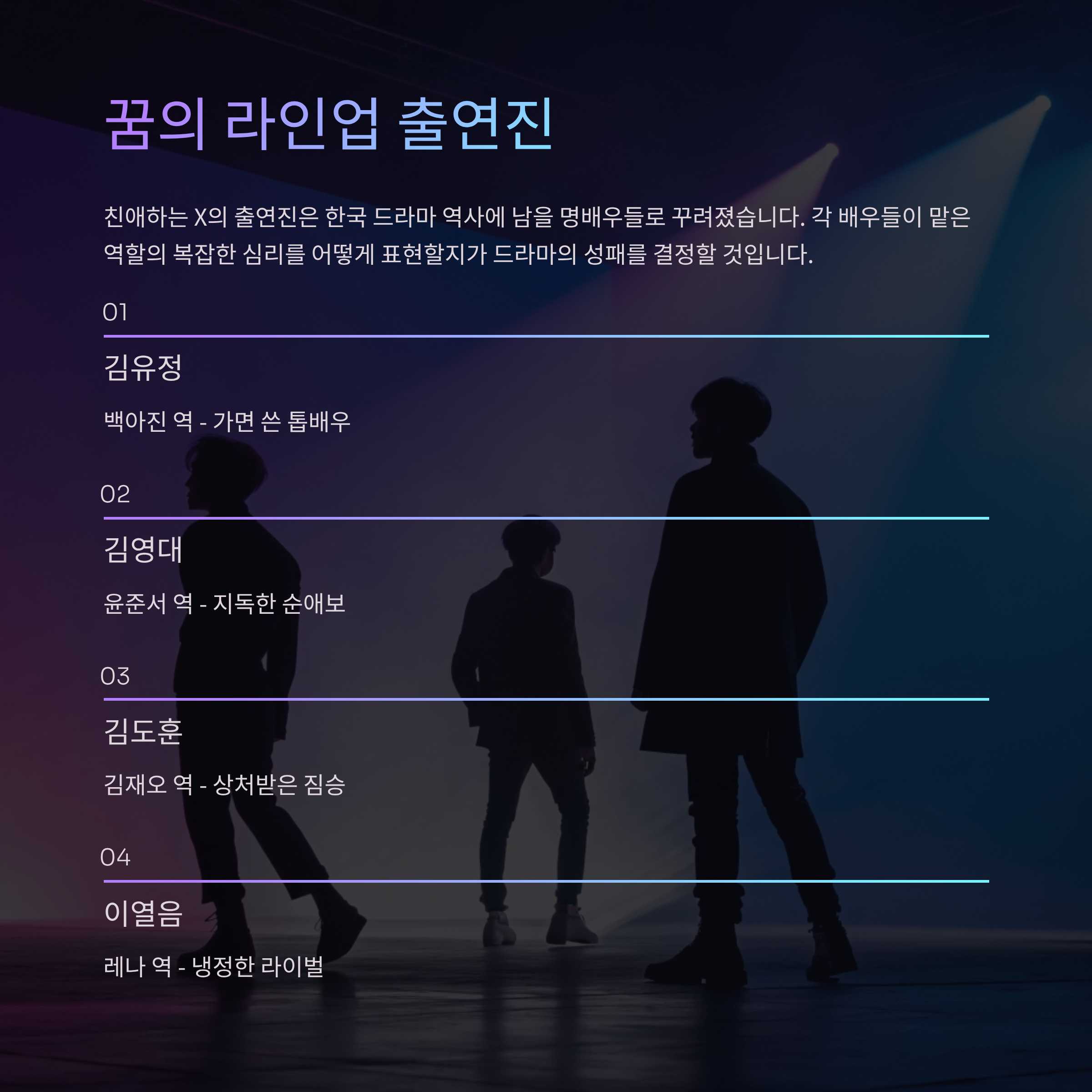 친애하는 X의 출연진은 한국 드라마 역사에 남을 명배우들로 꾸려졌습니다. 각 배우들이 맡은 역할의 복잡한 심리를 어떻게 표현할지가 드라마의 성패를 결정할 것입니다.