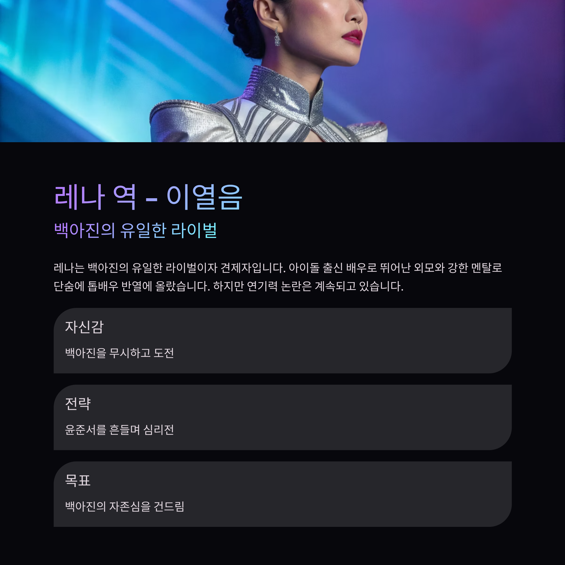 레나는 백아진의 유일한 라이벌이자 견제자입니다. 아이돌 출신 배우로 뛰어난 외모와 강한 멘탈로 단숨에 톱배우 반열에 올랐습니다. 하지만 연기력 논란은 계속되고 있습니다. 자신감 넘치는 레나는 백아진을 무시하고, 윤준서를 흔들며, 백아진의 자존심을 건드립니다.