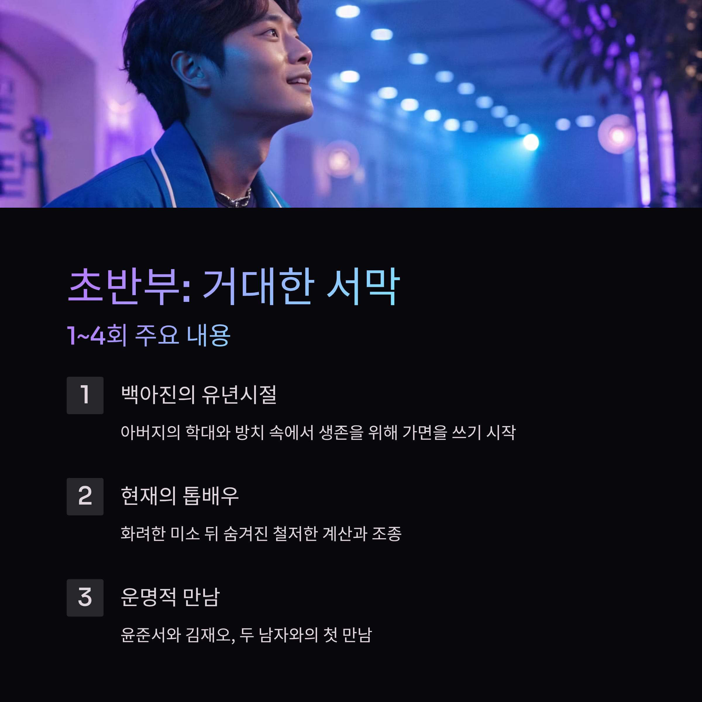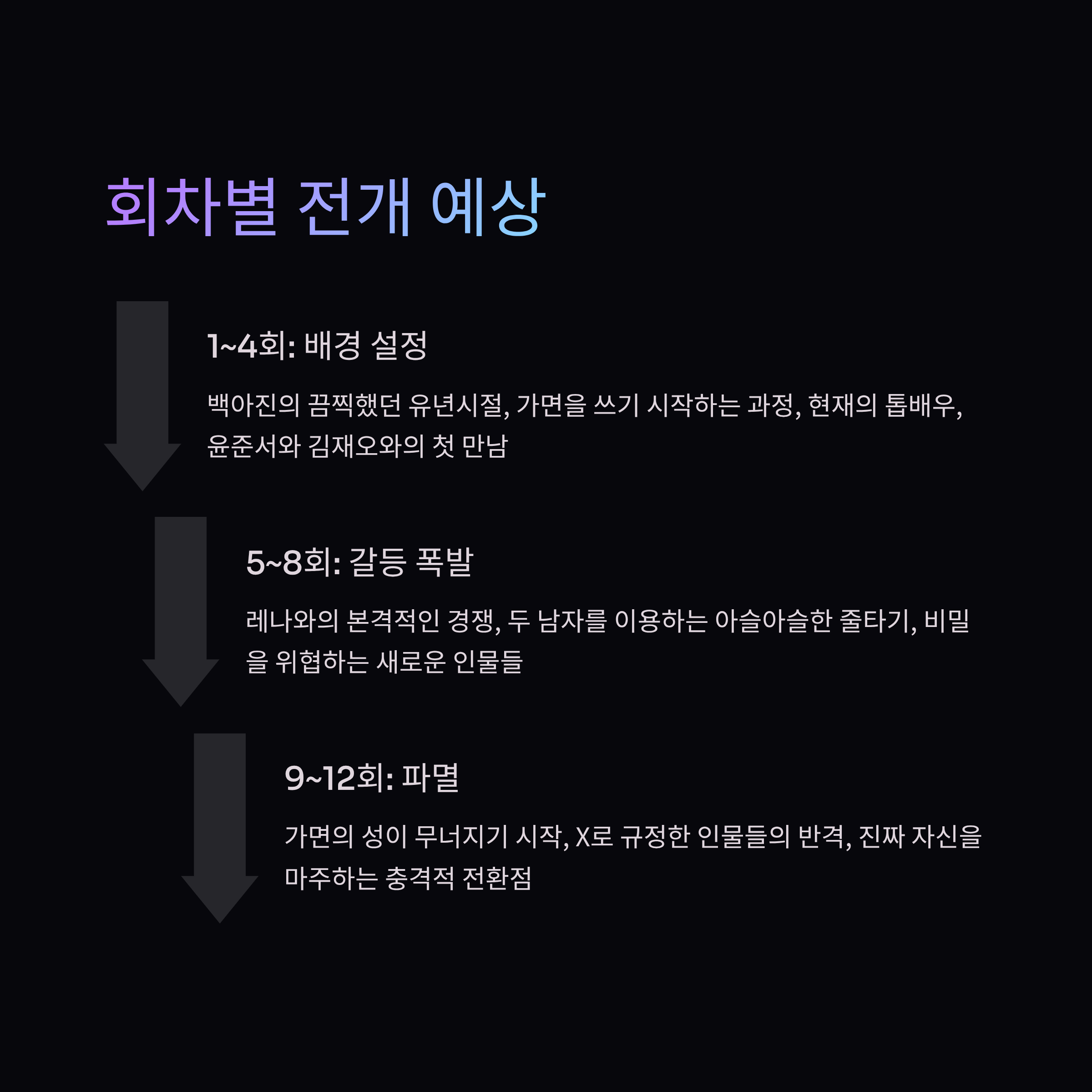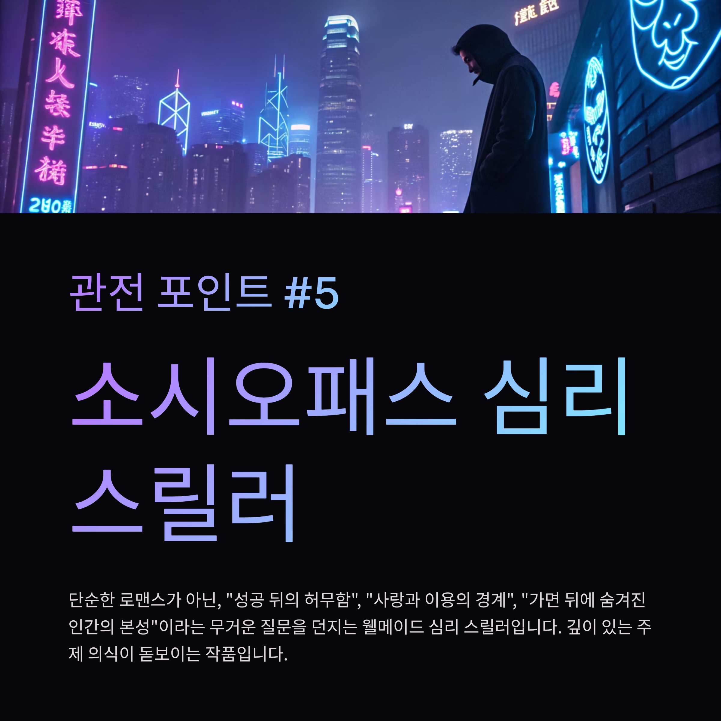 단순한 로맨스가 아닌, "성공 뒤의 허무함", "사랑과 이용의 경계", "가면 뒤에 숨겨진 인간의 본성"이라는 무거운 질문을 던지는 웰메이드 심리 스릴러입니다.