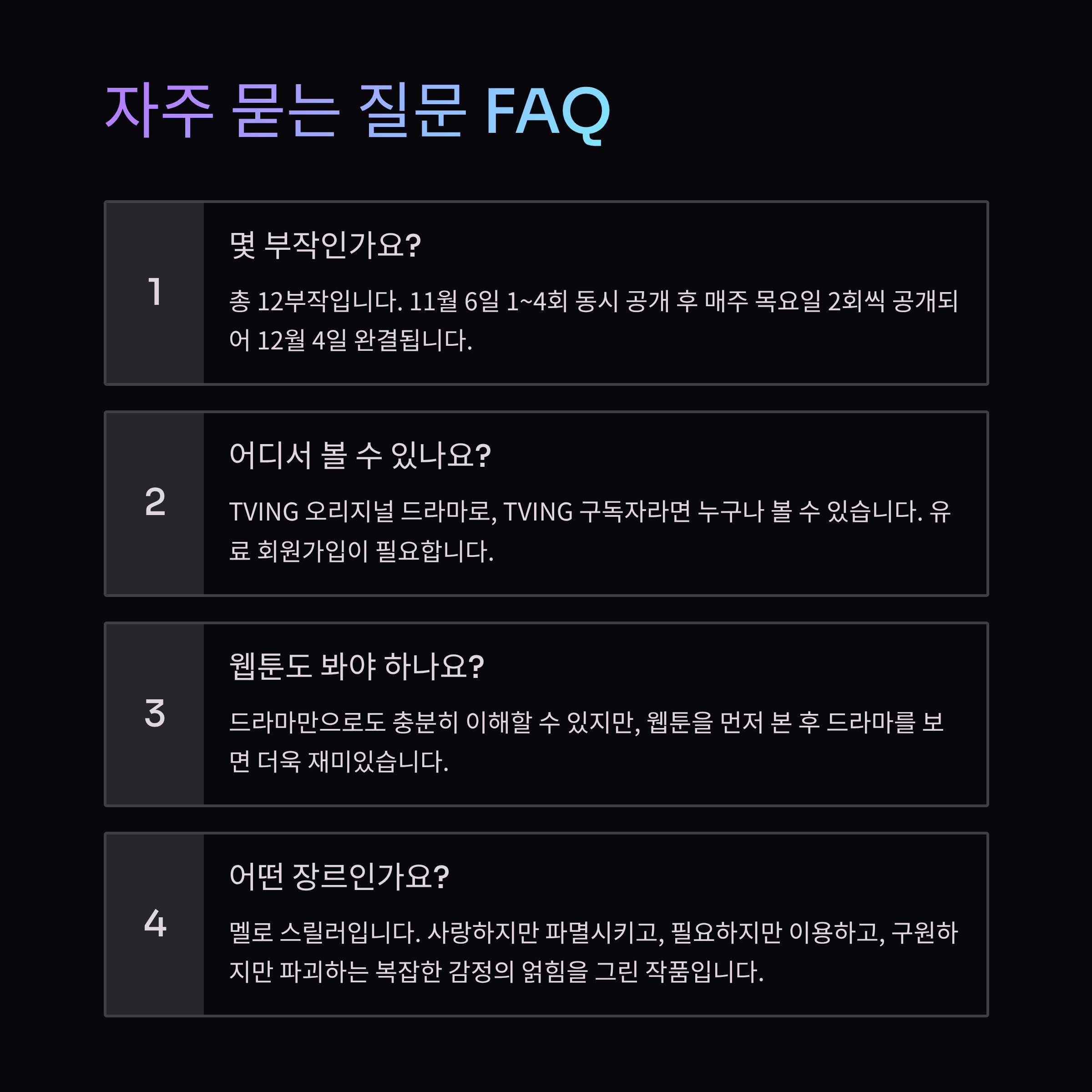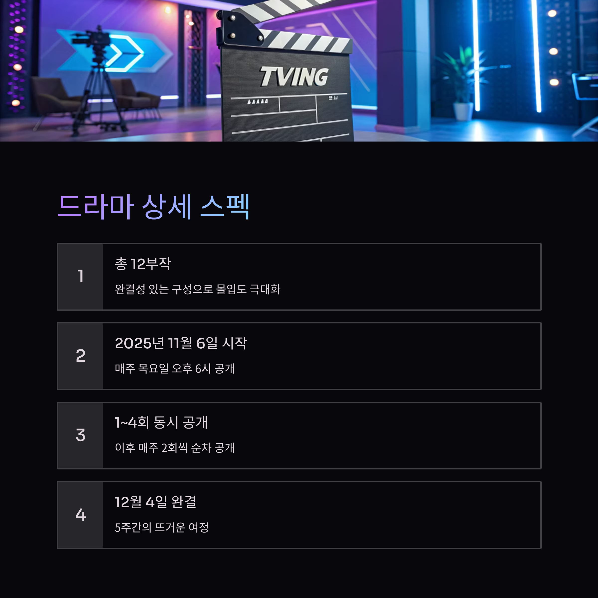 | 공개 방식 | 1회~4회 동시 공개, 이후 매주 목요일 2회씩 |