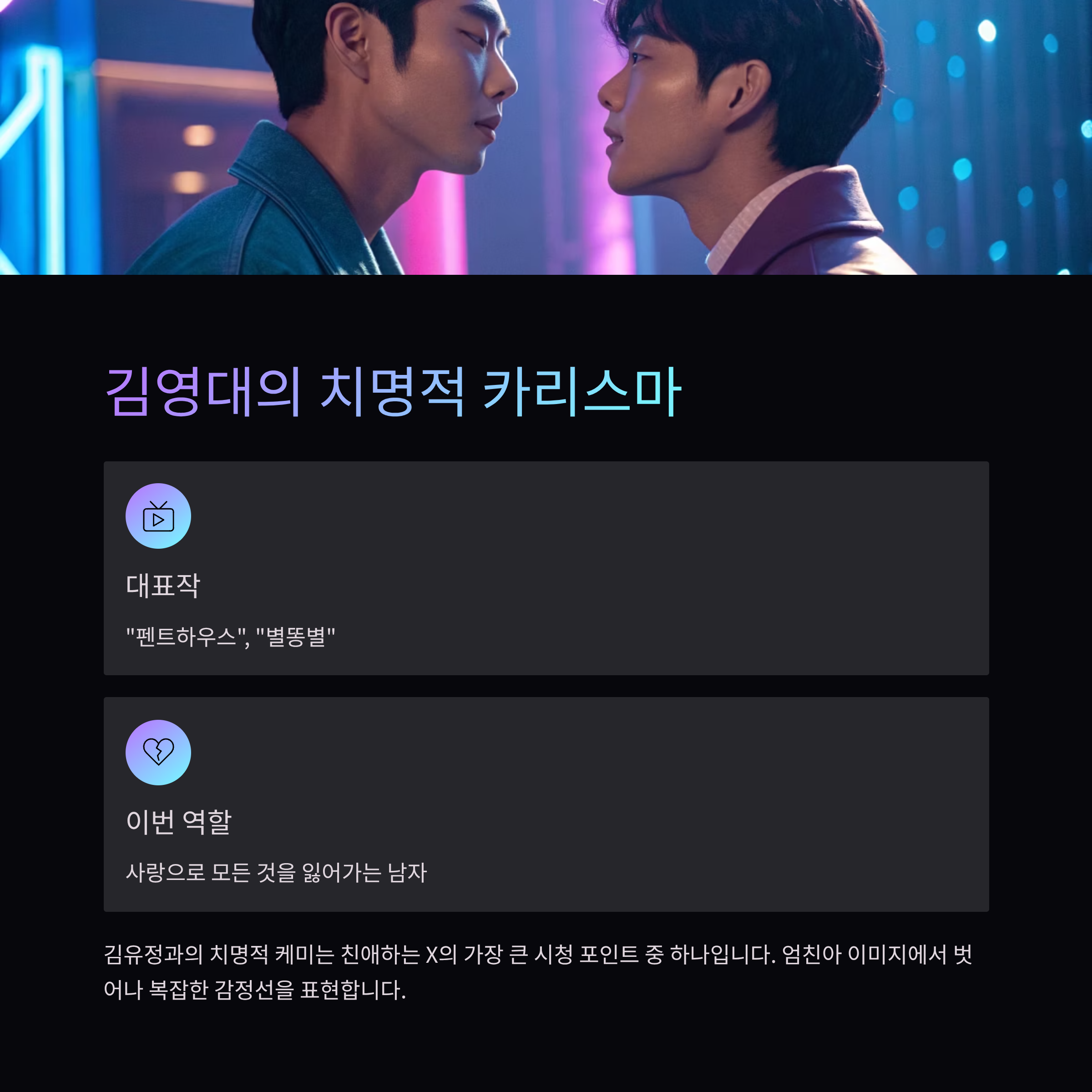 "펜트하우스", "별똥별" 등에서 엄친아 이미지로 주목받은 김영대가 이번 작품에서는 사랑이라는 이름으로 모든 것을 잃어가는 남자를 연기합니다. 김유정과의 치명적 케미는 친애하는 X의 가장 큰 시청 포인트 중 하나입니다.