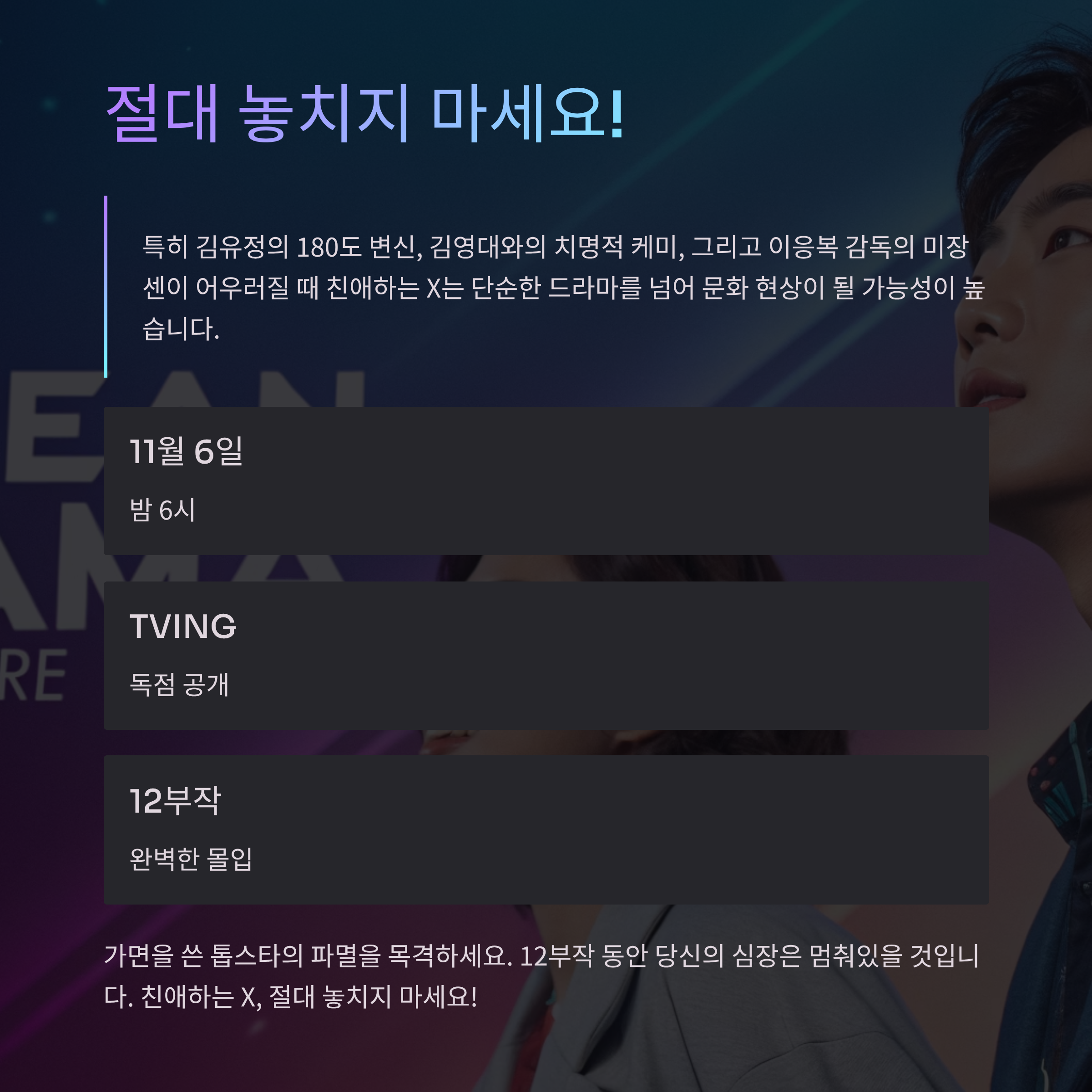 11월 6일 밤 6시, TVING을 켜고 가면을 쓴 톱스타의 파멸을 목격하세요. 12부작 동안 당신의 심장은 멈춰있을 것입니다. 친애하는 X, 절대 놓치지 마세요!