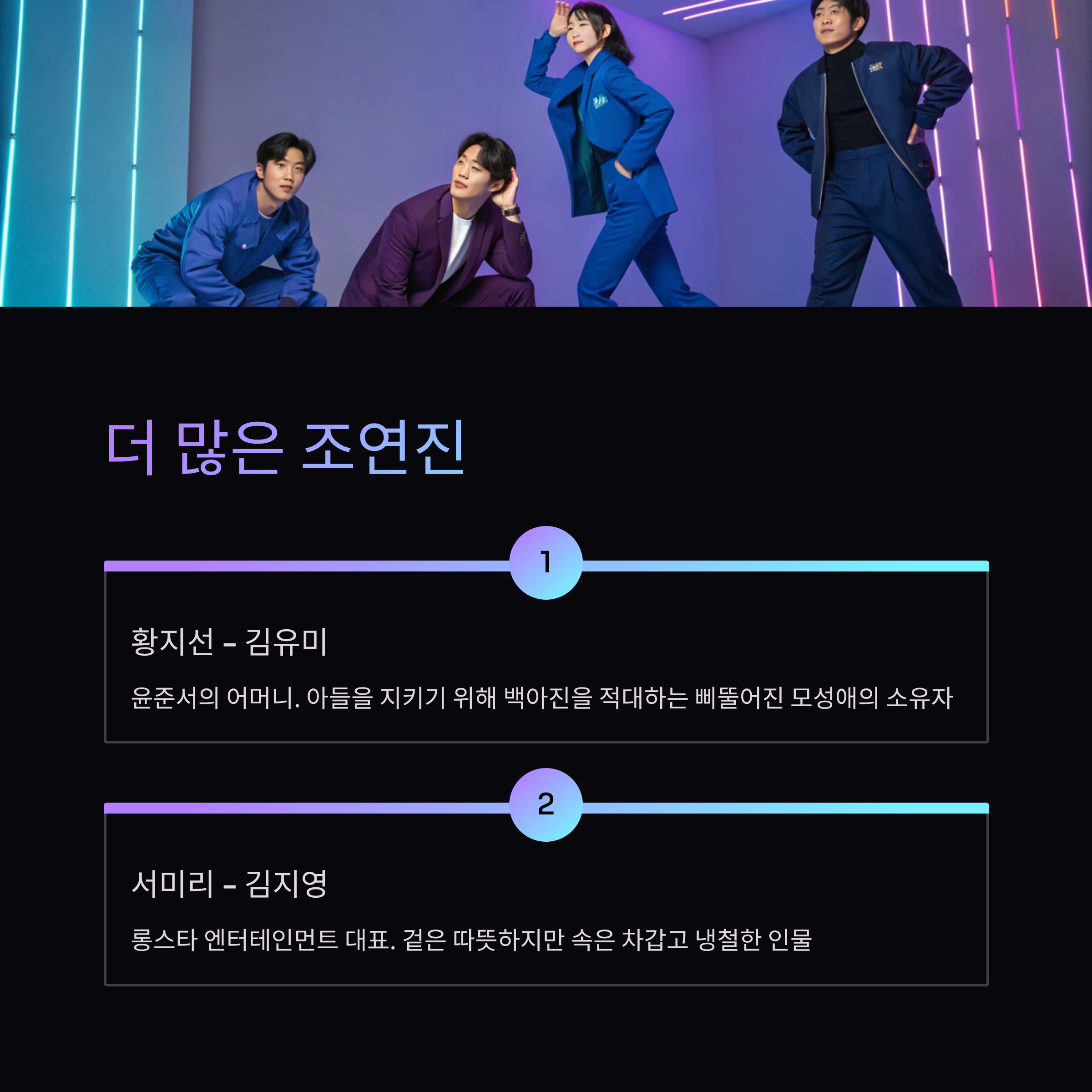 롱스타 엔터테인먼트 대표. 겉은 따뜻해 보이지만 속은 차갑고 냉철한 인물입니다. 백아진의 가능성을 처음 발견한 장본인으로, 함께 최고의 자리로 올라가며 또 다른 욕망의 주인공이 됩니다.