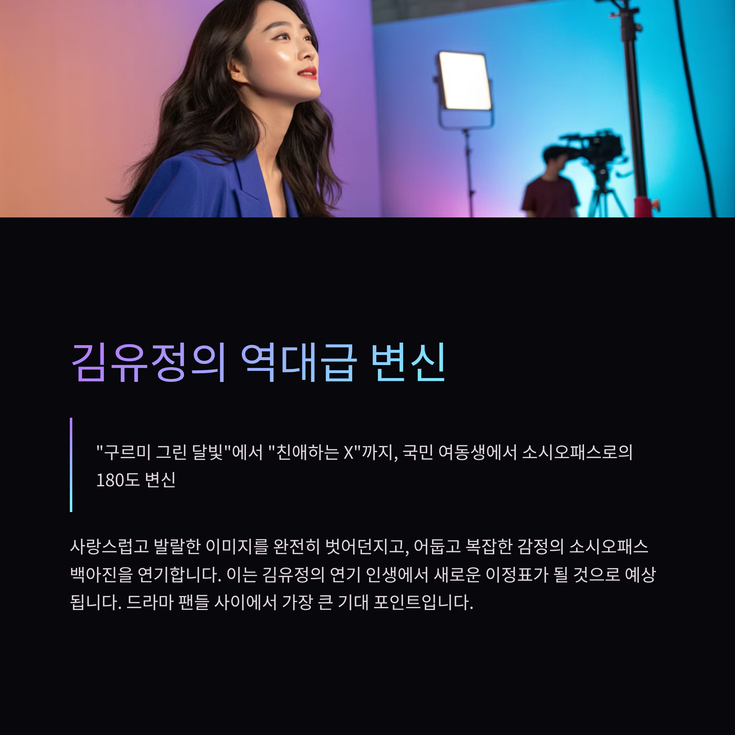 "구르미 그린 달빛", "마이 데몬" 등으로 국민 여동생 이미지를 확립한 김유정이 이번 작품에서 보여줄 180도 변신은 드라마 팬들 사이에서 가장 큰 기대 포인트입니다. 사랑스럽고 발랄한 이미지를 완전히 벗어던지고, 어둡고 복잡한 감정의 소시오패스 백아진을 연기합니다. 이는 김유정의 연기 인생에서 새로운 이정표가 될 것으로 예상됩니다.