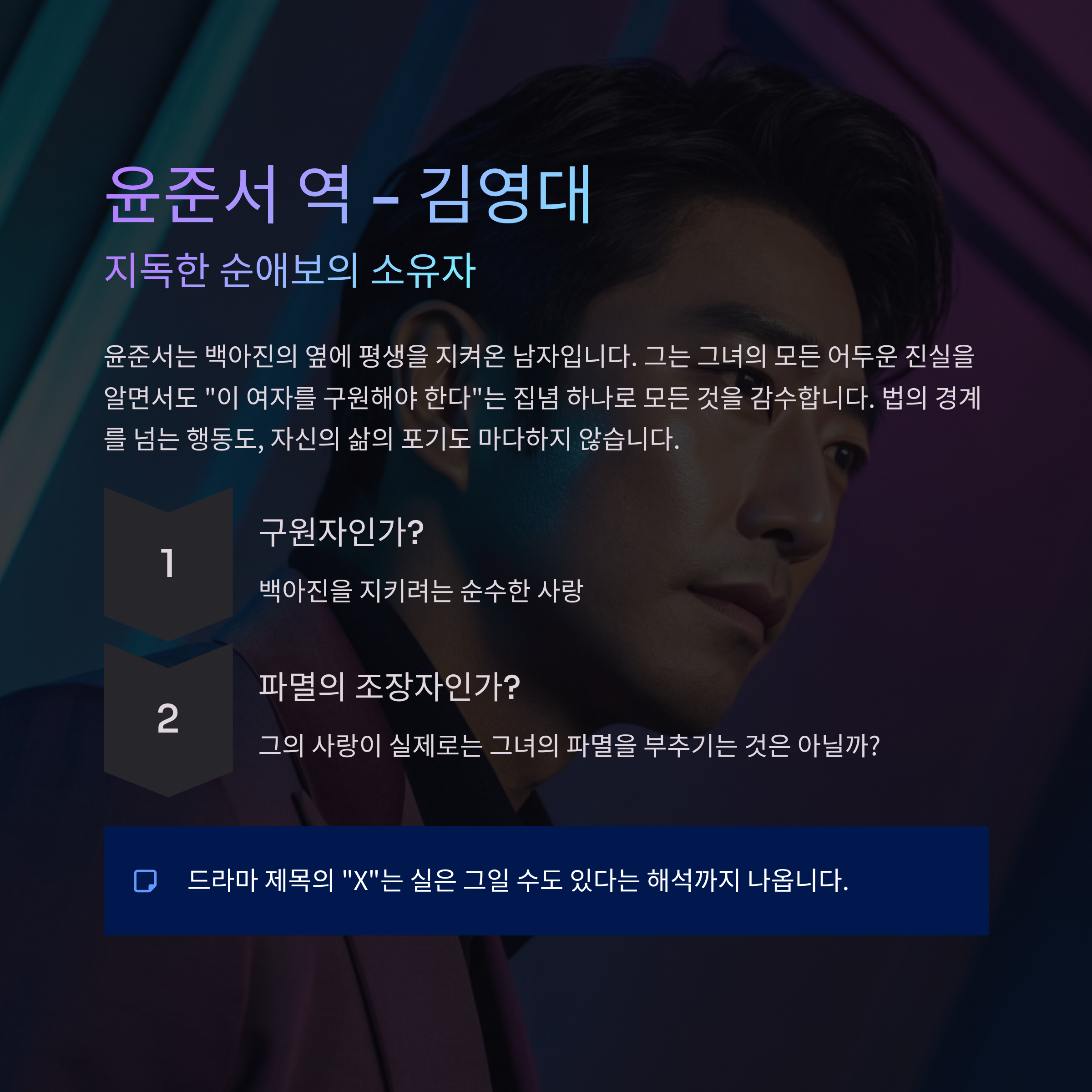 윤준서는 백아진의 옆에 평생을 지켜온 남자입니다. 그는 그녀의 모든 어두운 진실을 알면서도 "이 여자를 구원해야 한다"는 집념 하나로 모든 것을 감수합니다. 법의 경계를 넘는 행동도, 자신의 삶의 포기도 마다하지 않는 지독한 순애보의 소유자입니다.