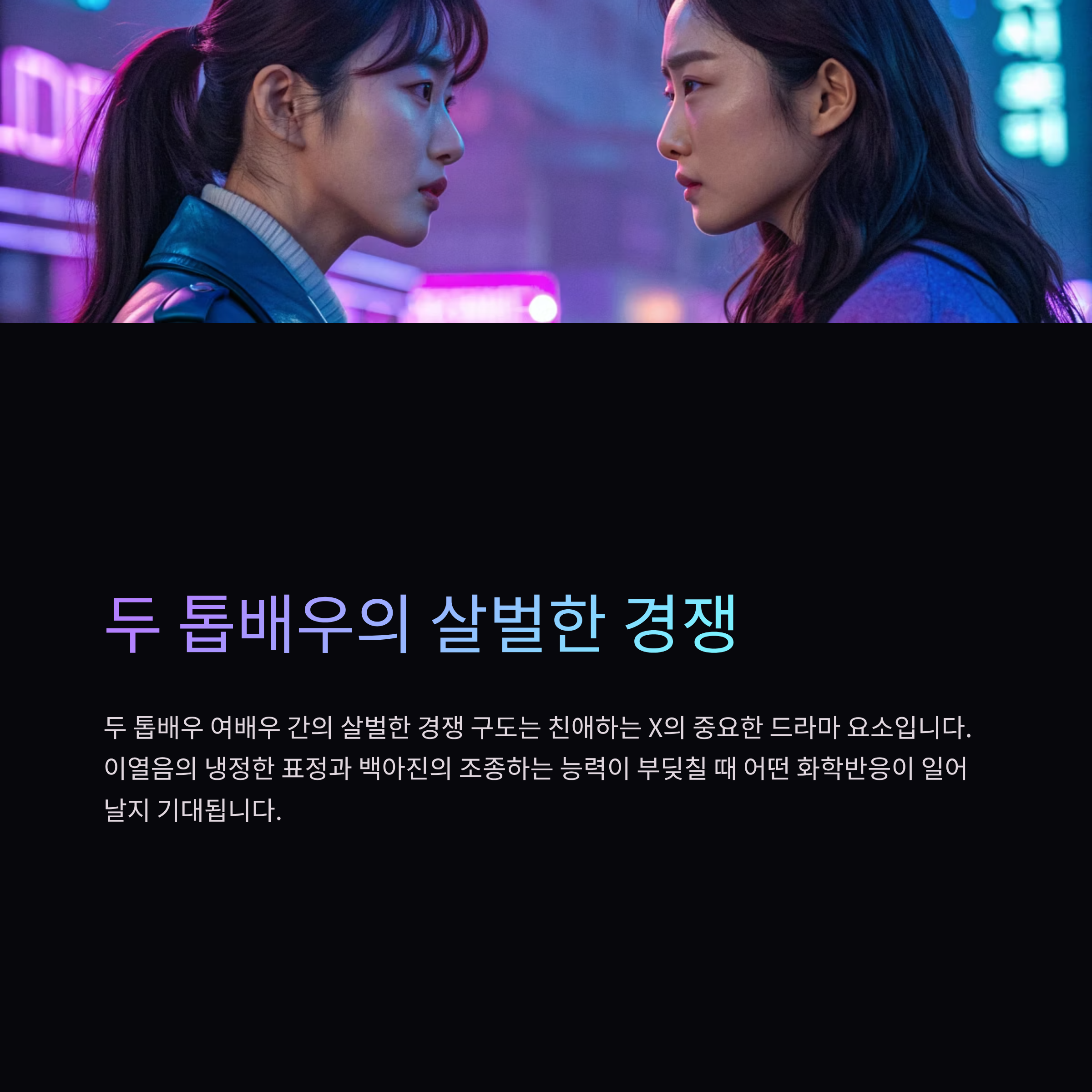 두 톱배우 여배우 간의 살벌한 경쟁 구도는 친애하는 X의 중요한 드라마 요소입니다. 이열음의 냉정한 표정과 백아진의 조종하는 능력이 부딪칠 때 어떤 화학반응이 일어날지 기대됩니다.