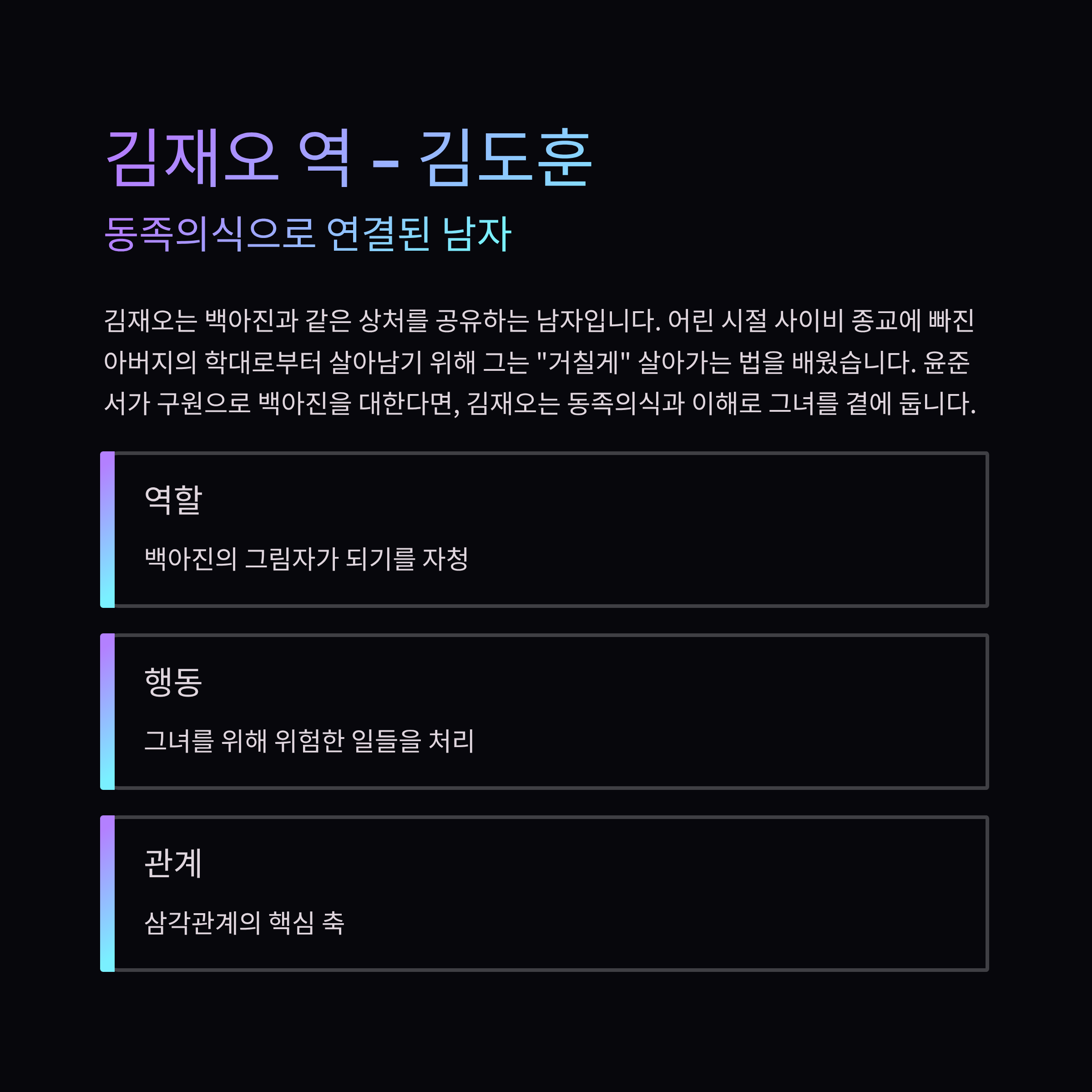 김재오는 백아진의 그림자가 되기를 자청합니다. 그녀의 손과 발이 되어 위험한 일들을 처리하고, 필요하면 그녀를 위해 범죄도 저지릅니다. 윤준서의 순애보와는 다른 방식으로 백아진과 연결된 그는 삼각관계의 핵심 축을 이룹니다.