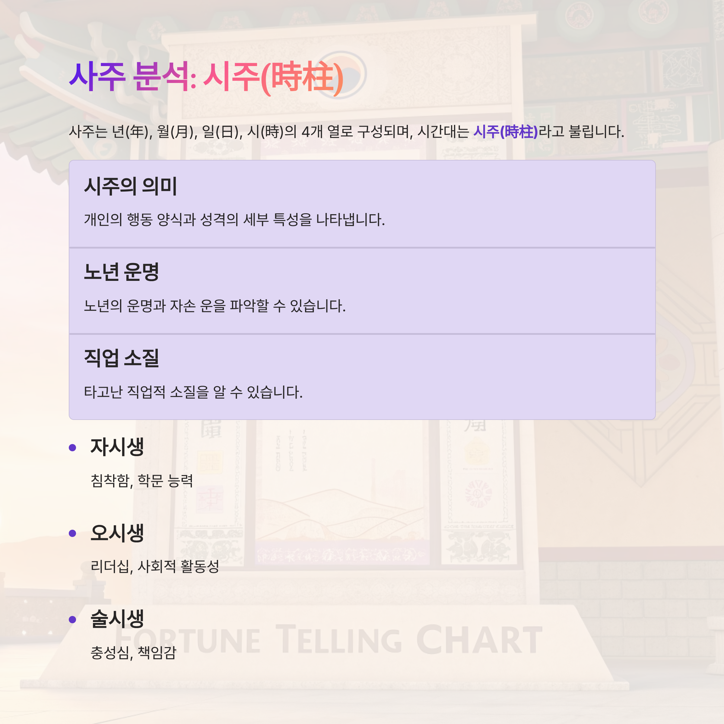 - 사주 분석: 정확한 출생 시간으로 더욱 정교한 성격 분석