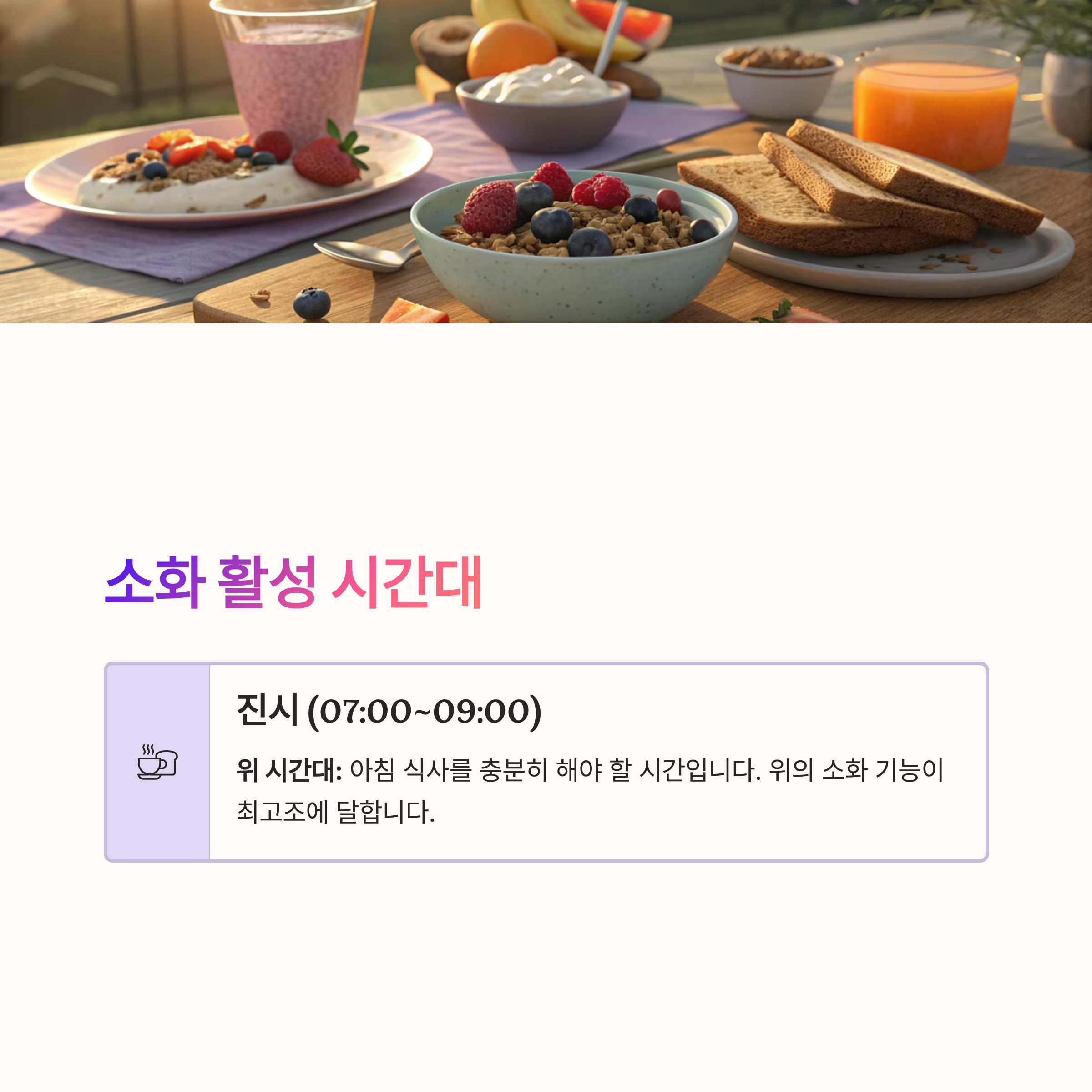 | 07:00~09:00 | 진시 | 위(胃) | 소화 활성 |