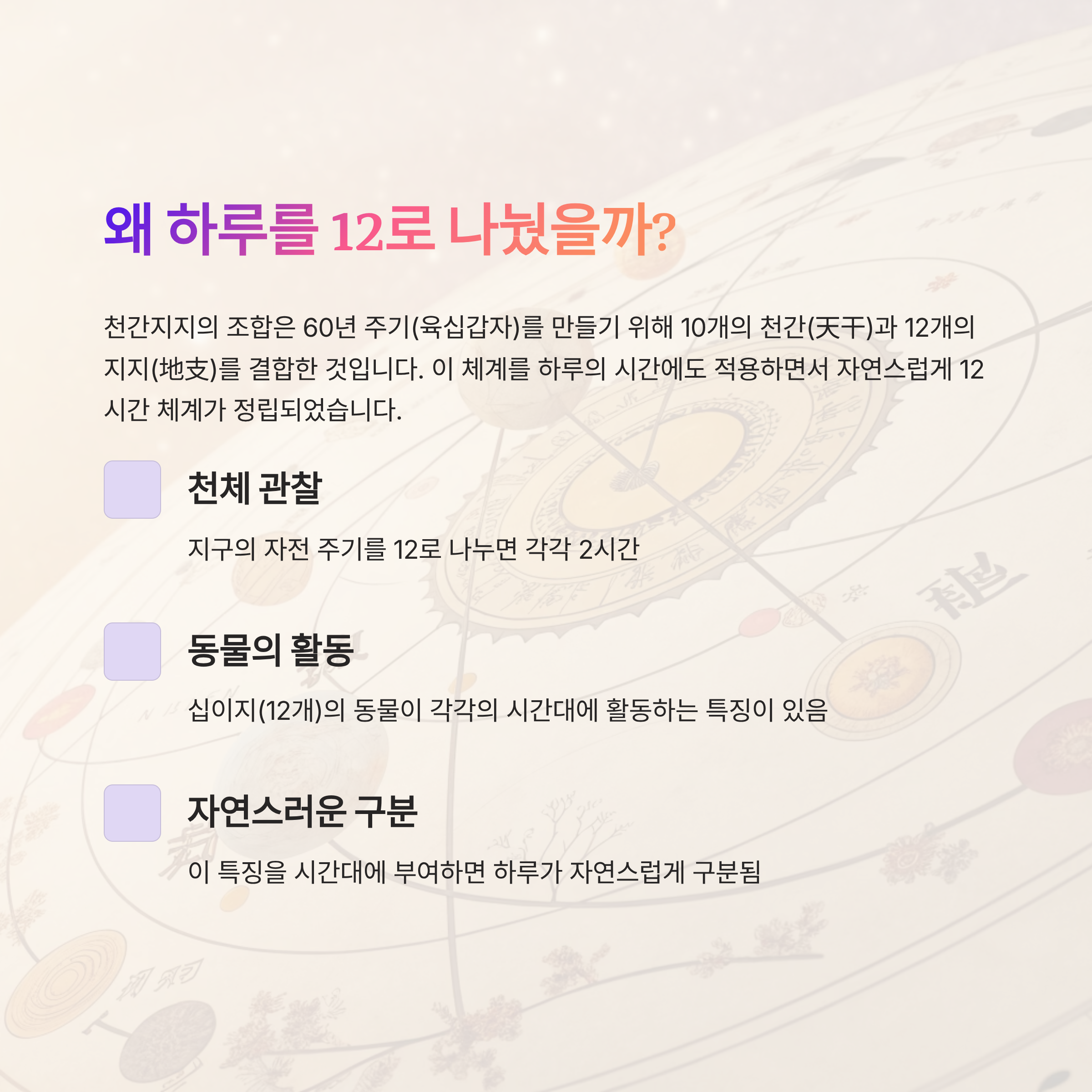 천간지지의 조합은 60년 주기(육십갑자)를 만들기 위해 10개의 천간(天干)과 12개의 지지(地支)를 결합한 것입니다. 이 체계를 하루의 시간에도 적용하면서 자연스럽게 12시간 체계가 정립되었습니다.
