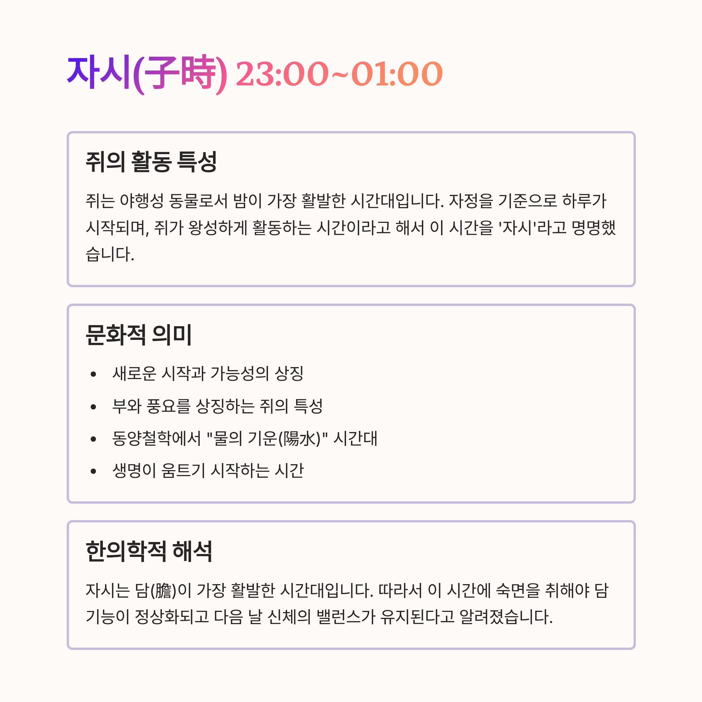 | 1 | 子 | 쥐 | 자시 | 23:00~01:00 | 밤의 시작, 활동 활발 |