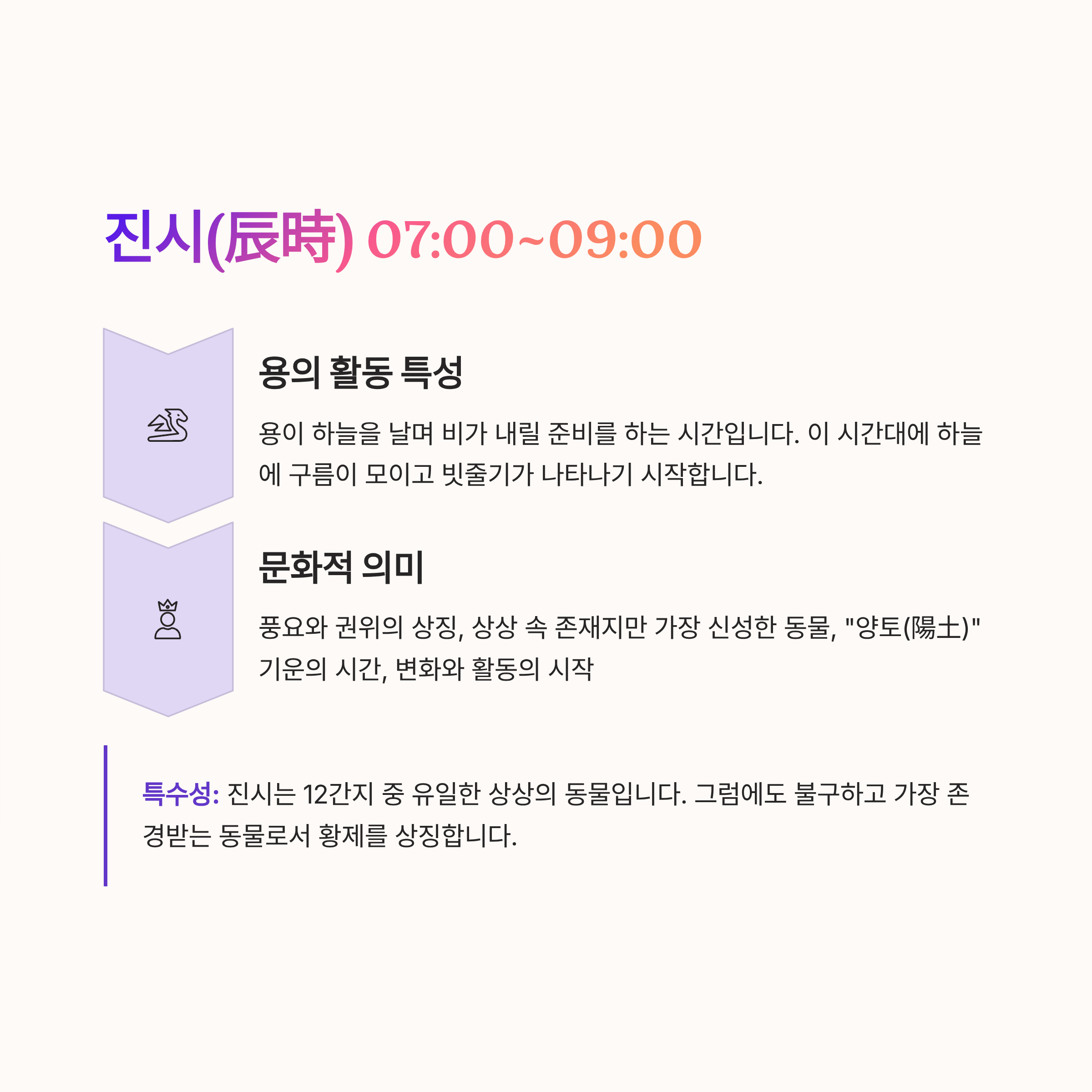 | 5 | 辰 | 용 | 진시 | 07:00~09:00 | 비 내릴 준비 |