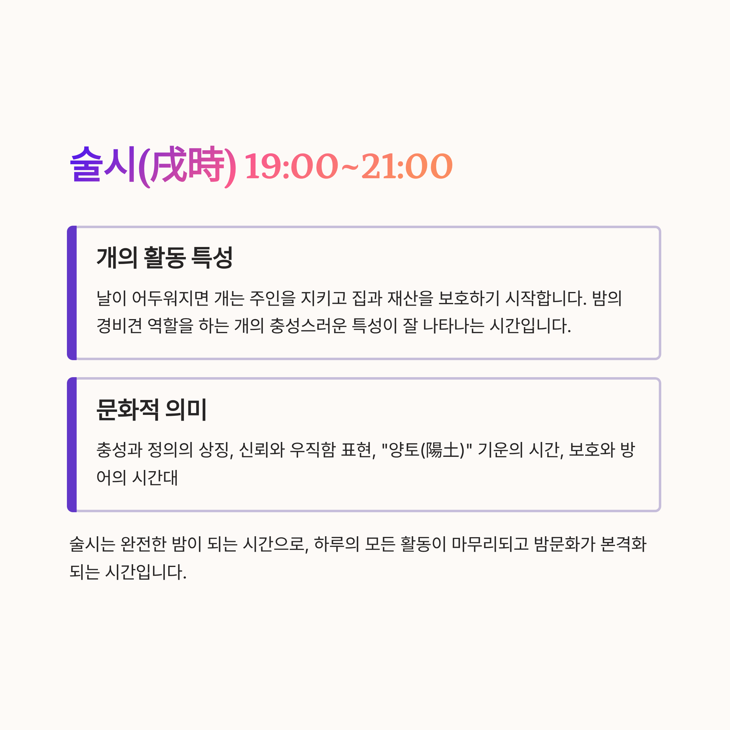 | 11 | 戌 | 개 | 술시 | 19:00~21:00 | 집 지키기 |