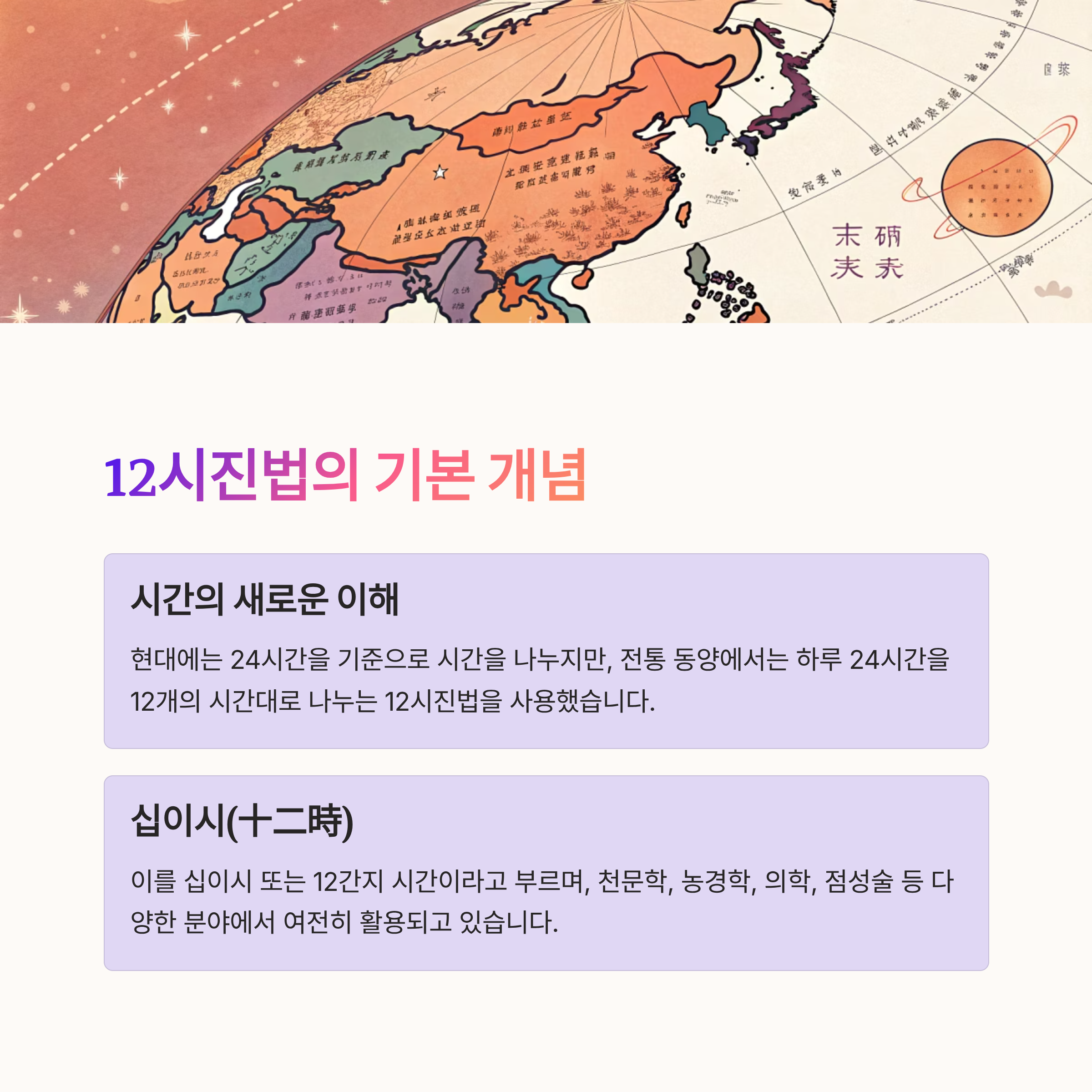 현대에는 24시간을 기준으로 시간을 나누지만, 전통 동양에서는 하루 24시간을 12개의 시간대로 나누는 12시진법을 사용했습니다. 이를 십이시(十二時) 또는 12간지 시간이라고 부릅니다.