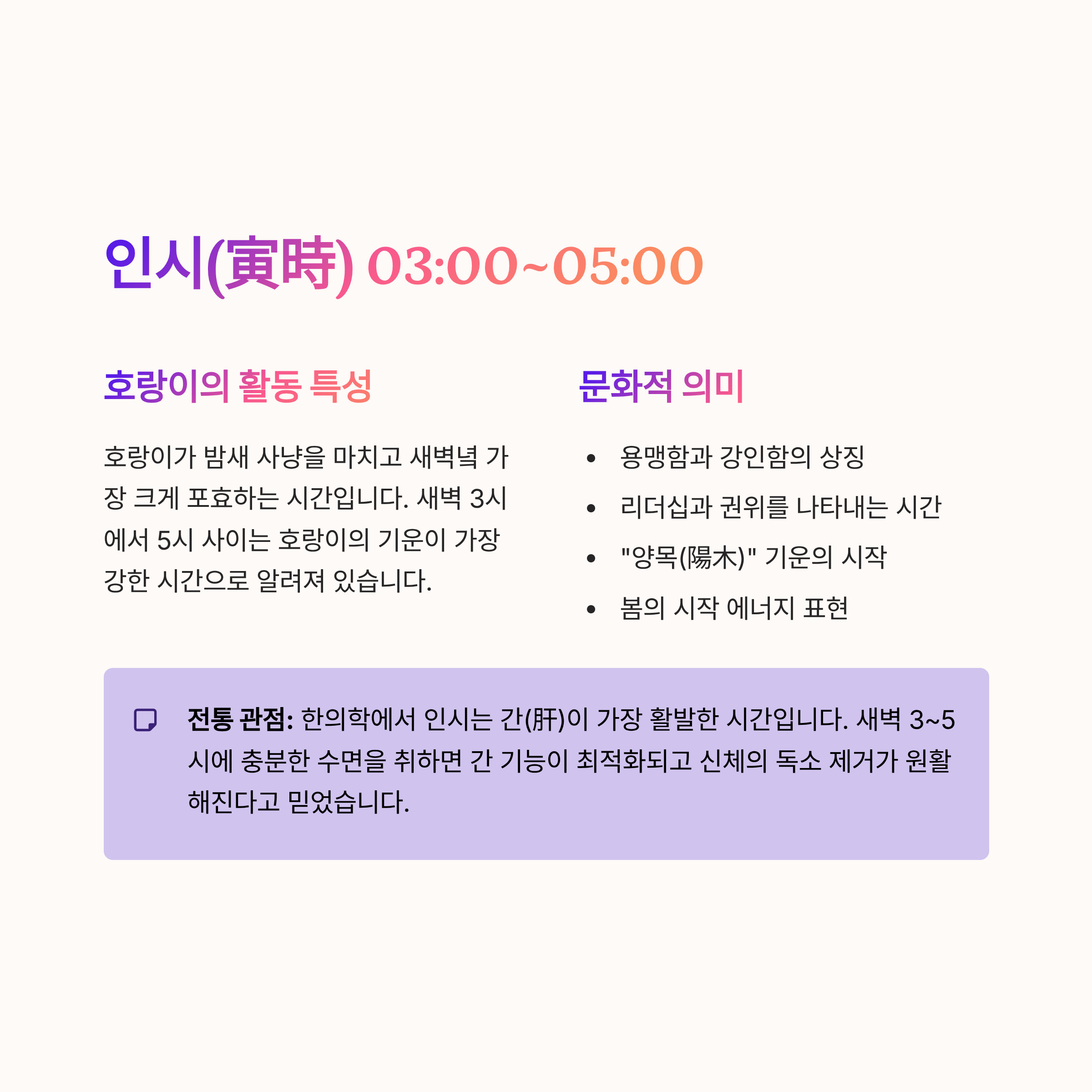| 3 | 寅 | 호랑이 | 인시 | 03:00~05:00 | 맹수 활동 |