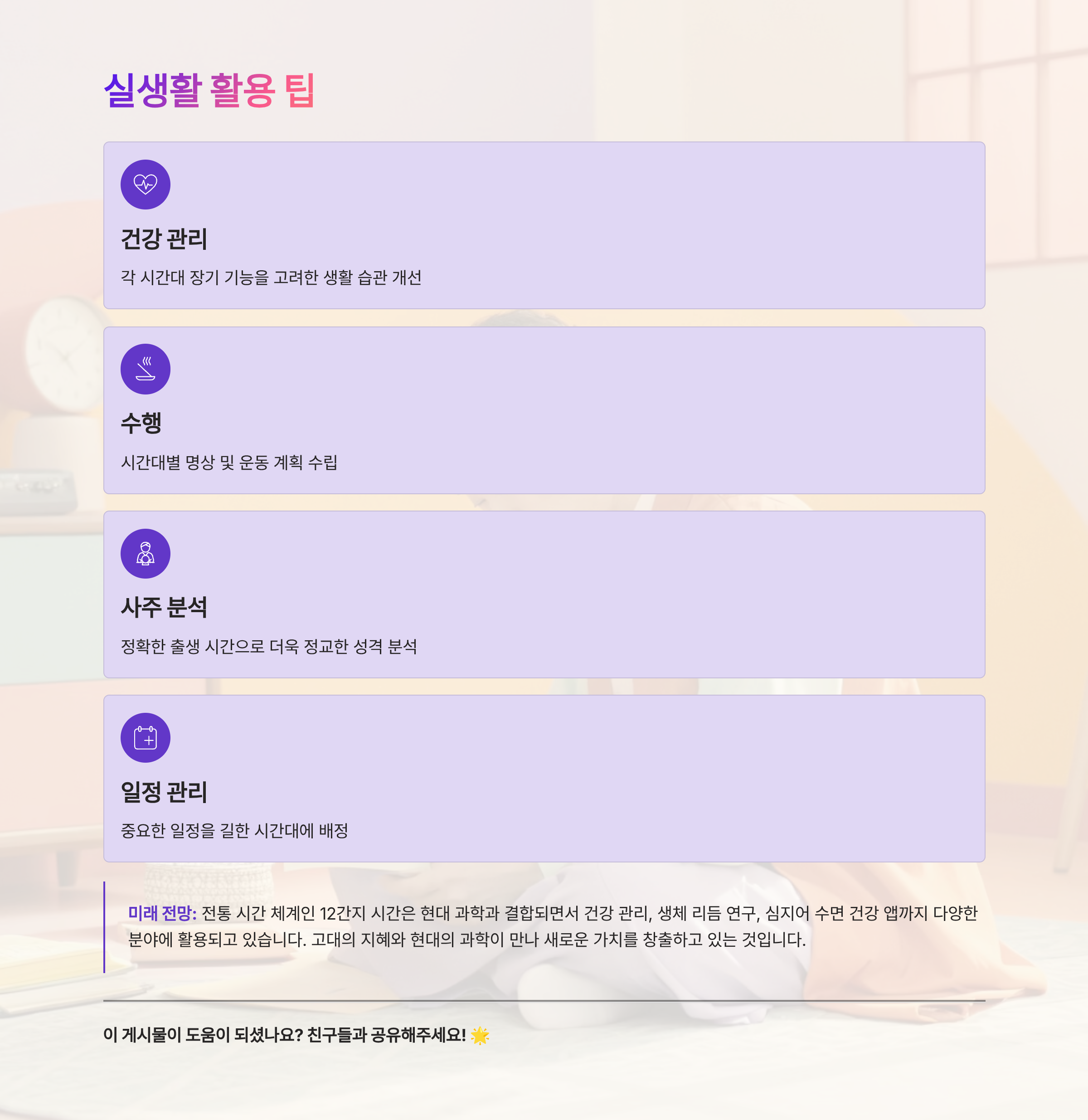 - 건강 관리: 각 시간대 장기 기능을 고려한 생활 습관 개선