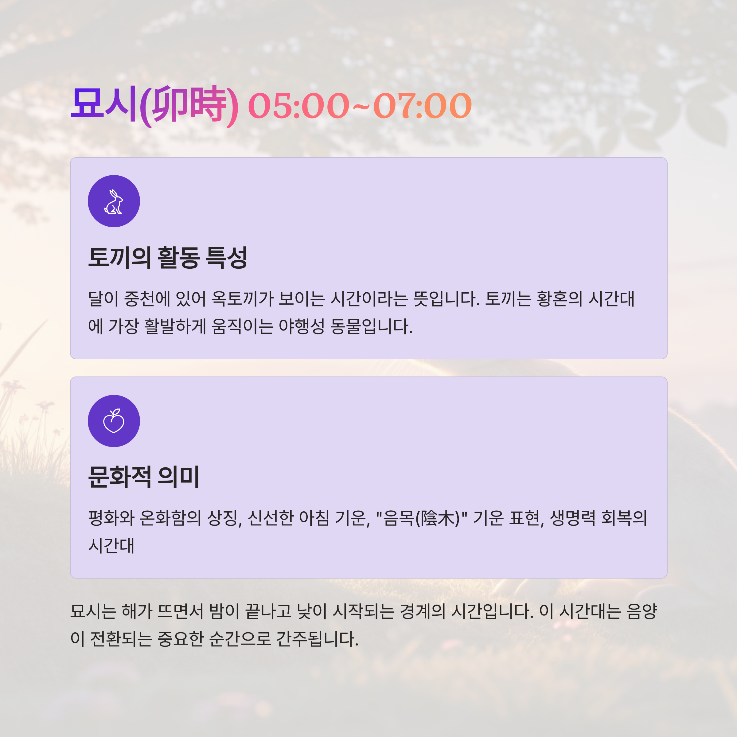 묘시는 해가 뜨면서 밤이 끝나고 낮이 시작되는 경계의 시간입니다. 이 시간대는 음양이 전환되는 중요한 순간으로 간주됩니다.