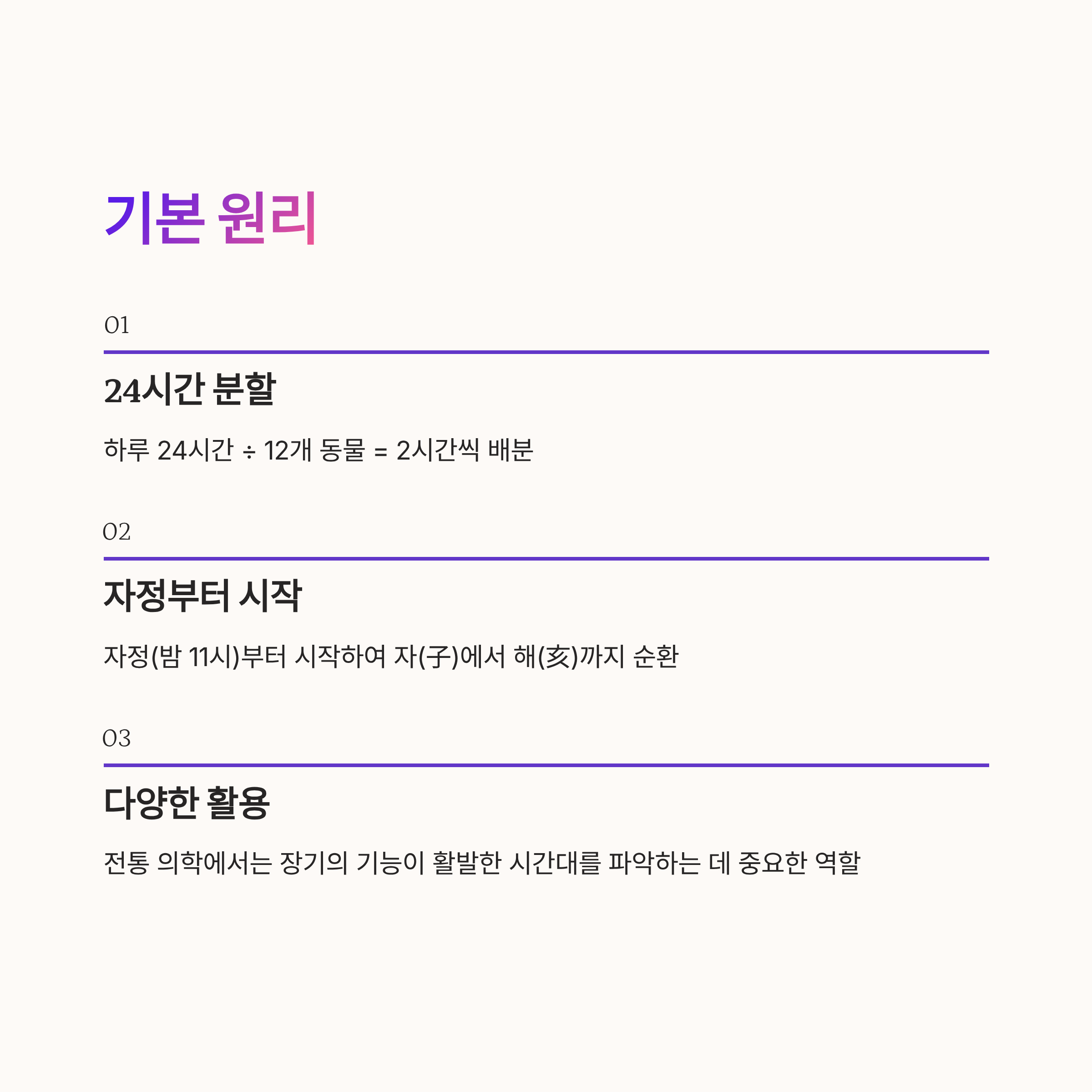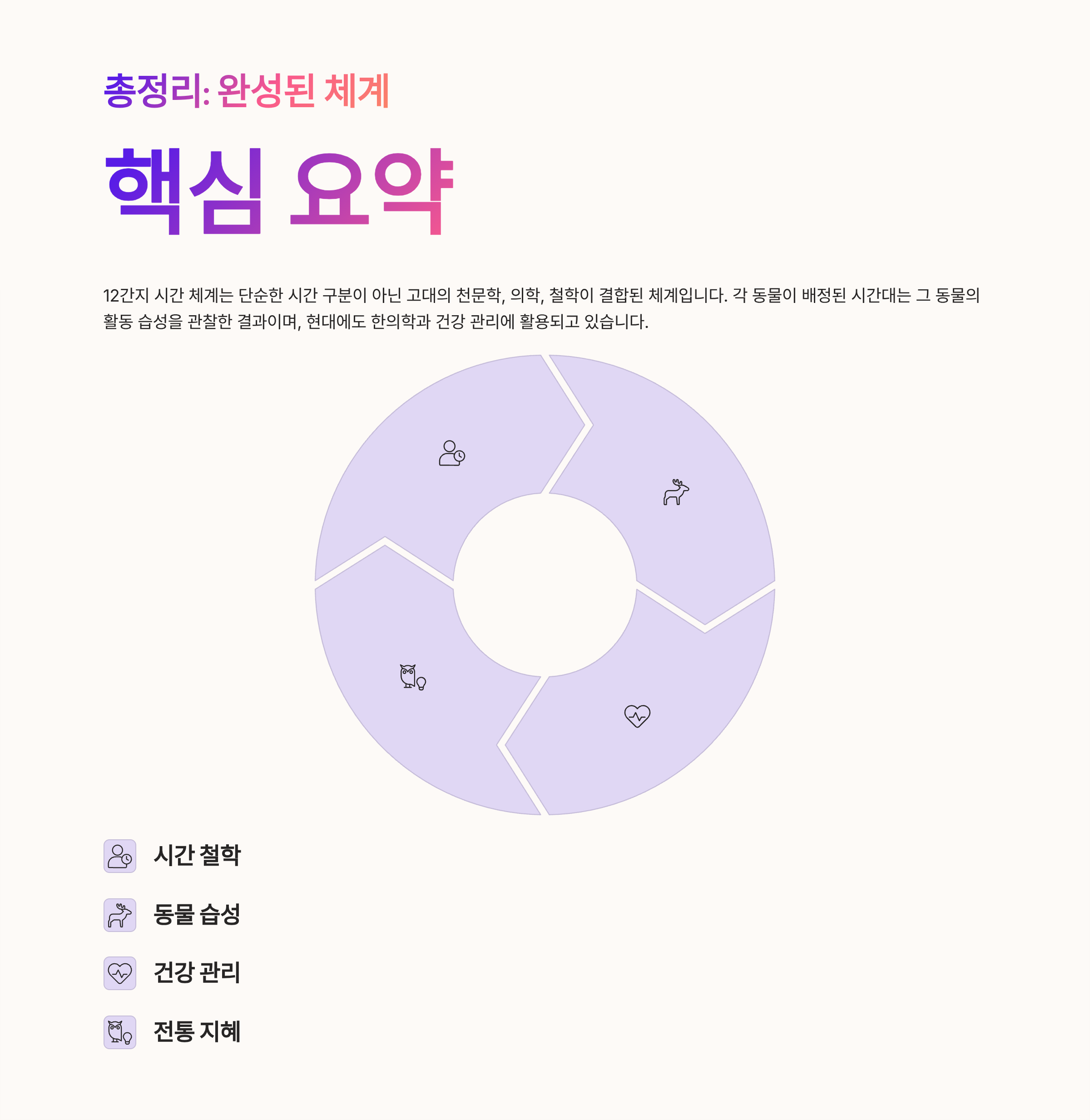 12간지 시간 체계는 단순한 시간 구분이 아닌 고대의 천문학, 의학, 철학이 결합된 체계입니다. 각 동물이 배정된 시간대는 그 동물의 활동 습성을 관찰한 결과이며, 현대에도 한의학과 건강 관리에 활용되고 있습니다.
