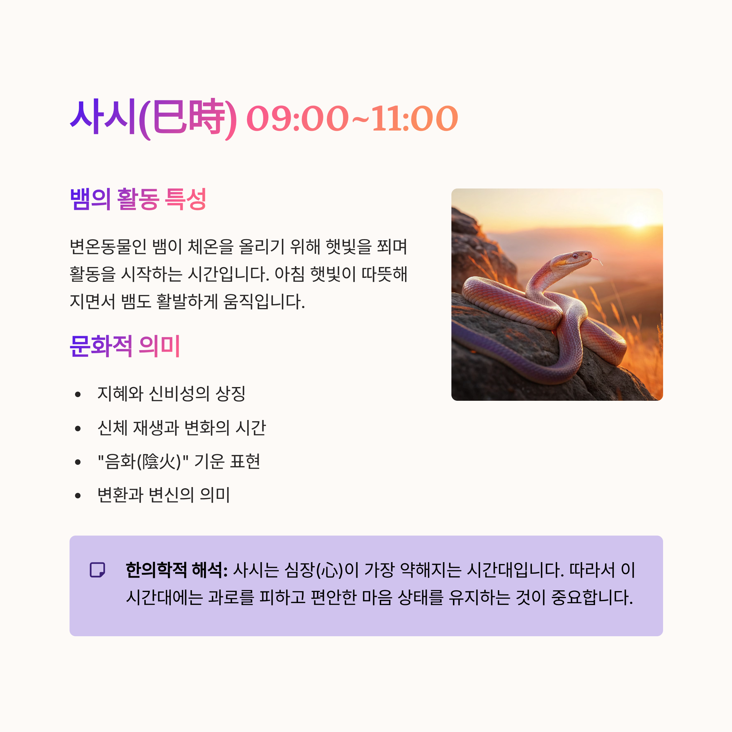 | 6 | 巳 | 뱀 | 사시 | 09:00~11:00 | 햇빛에 체온 올림 |
