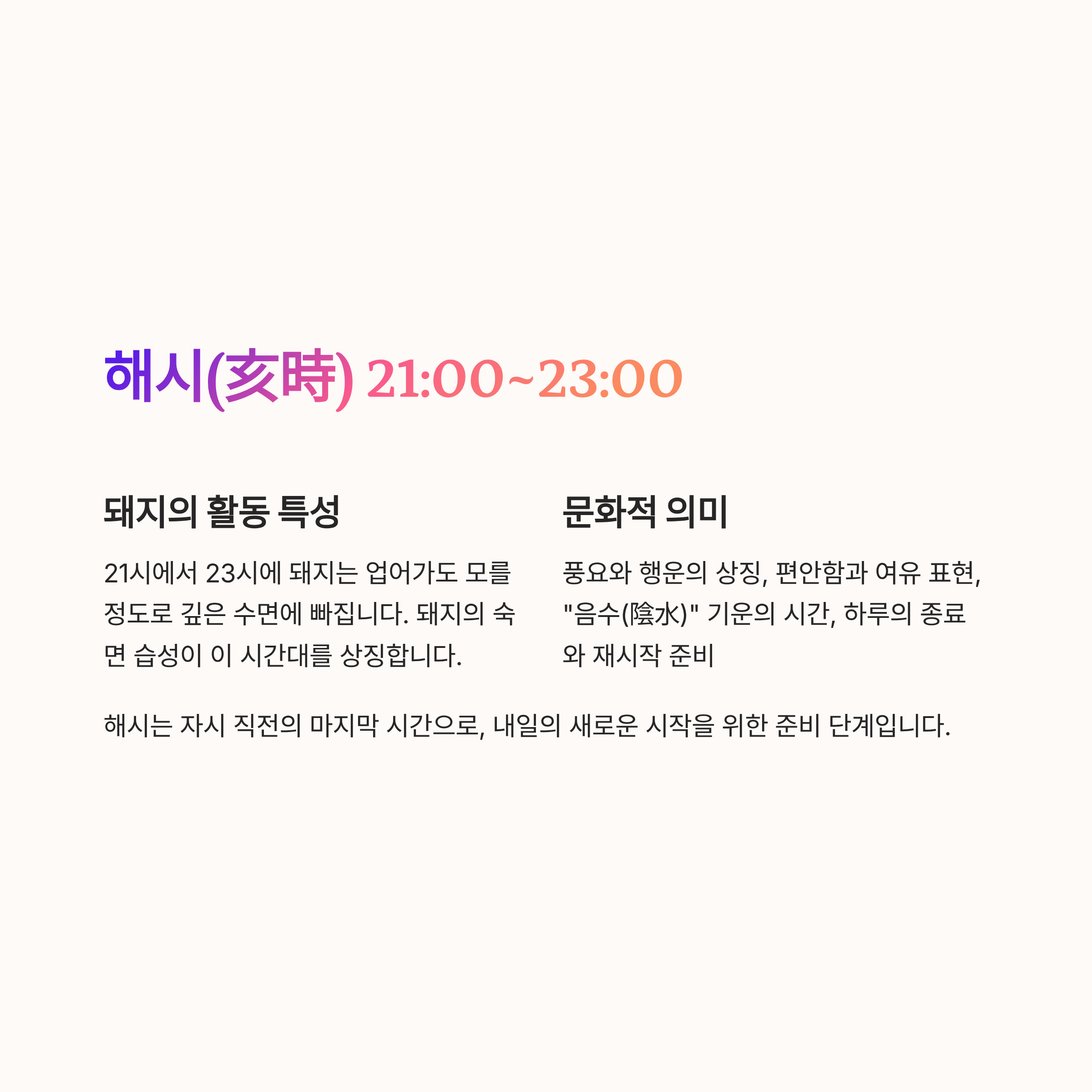 | 12 | 亥 | 돼지 | 해시 | 21:00~23:00 | 깊은 수면 |