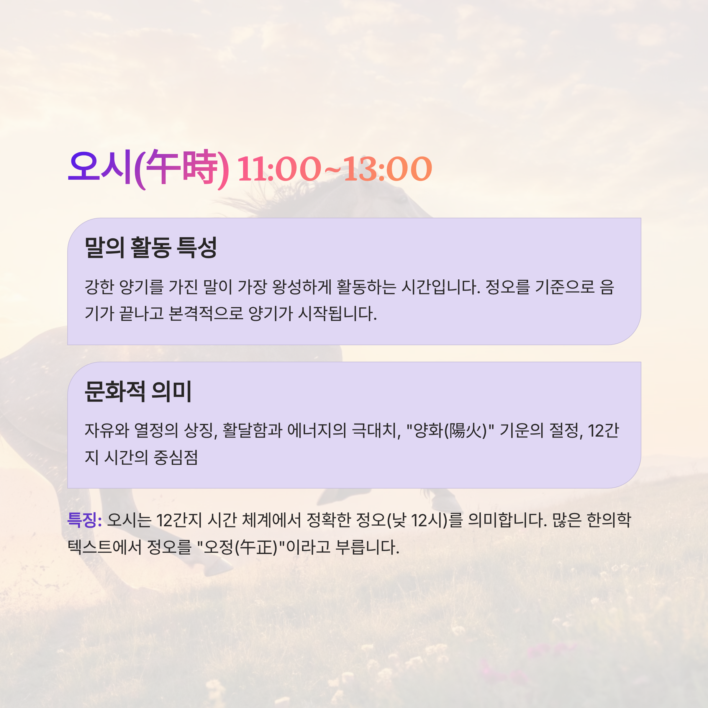 강한 양기를 가진 말이 가장 왕성하게 활동하는 시간입니다. 정오를 기준으로 음기가 끝나고 본격적으로 양기가 시작됩니다.