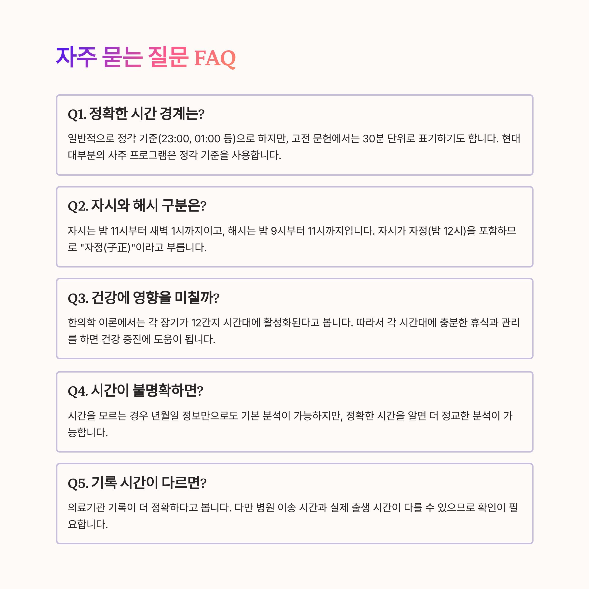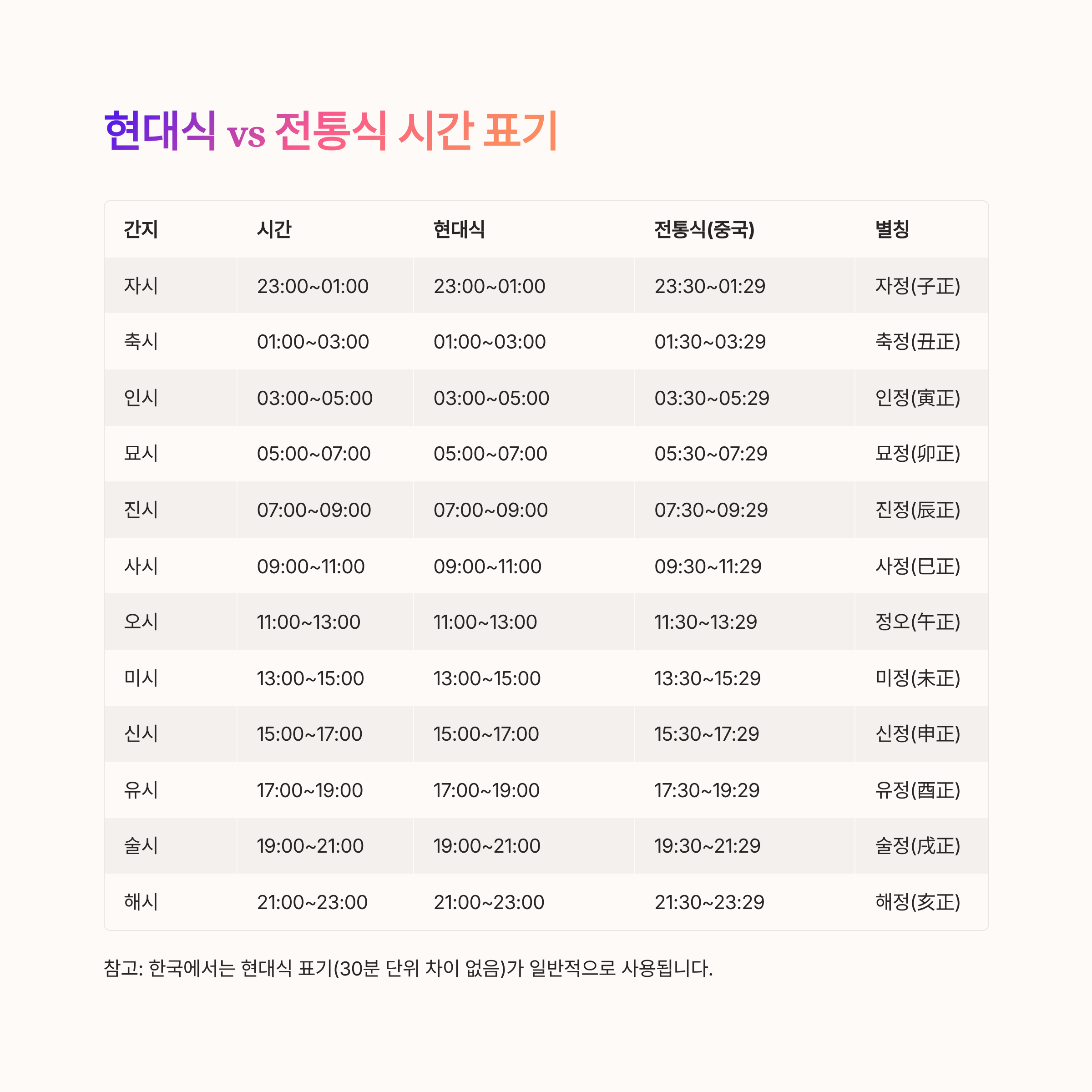 A. 일반적으로 정각 기준(23:00, 01:00 등)으로 하지만, 고전 문헌에서는 30분 단위로 표기하기도 합니다. 현대 대부분의 사주 프로그램은 정각 기준을 사용합니다.
