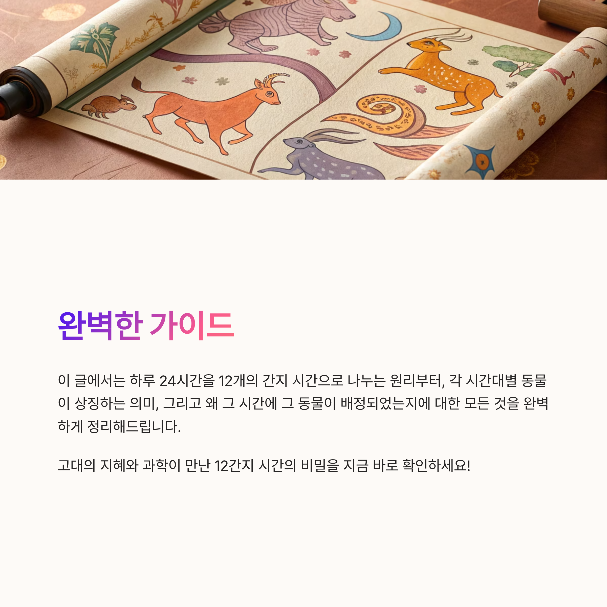 이 글에서는 하루 24시간을 12개의 간지 시간으로 나누는 원리부터, 각 시간대별 동물이 상징하는 의미, 그리고 왜 그 시간에 그 동물이 배정되었는지에 대한 모든 것을 완벽하게 정리해드립니다. 고대의 지혜와 과학이 만난 12간지 시간의 비밀을 지금 바로 확인하세요!