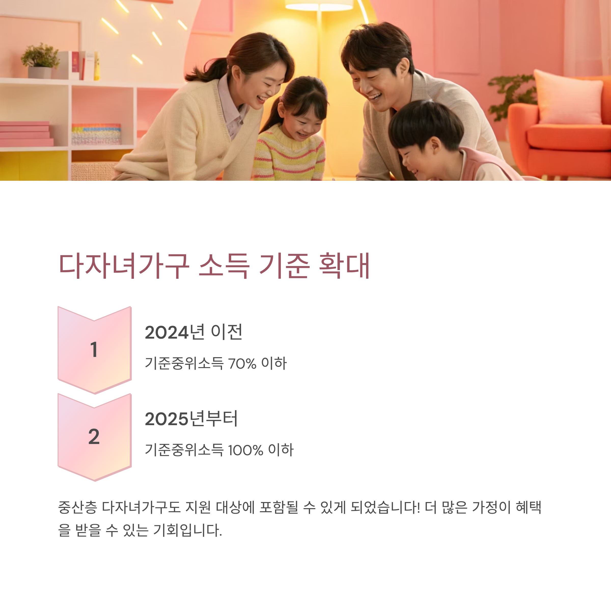 2025년부터 다자녀가구의 소득 기준이 기준중위소득 70%에서 100% 이하로 확대되었습니다. 중산층 다자녀가구도 지원 대상에 포함될 수 있습니다.