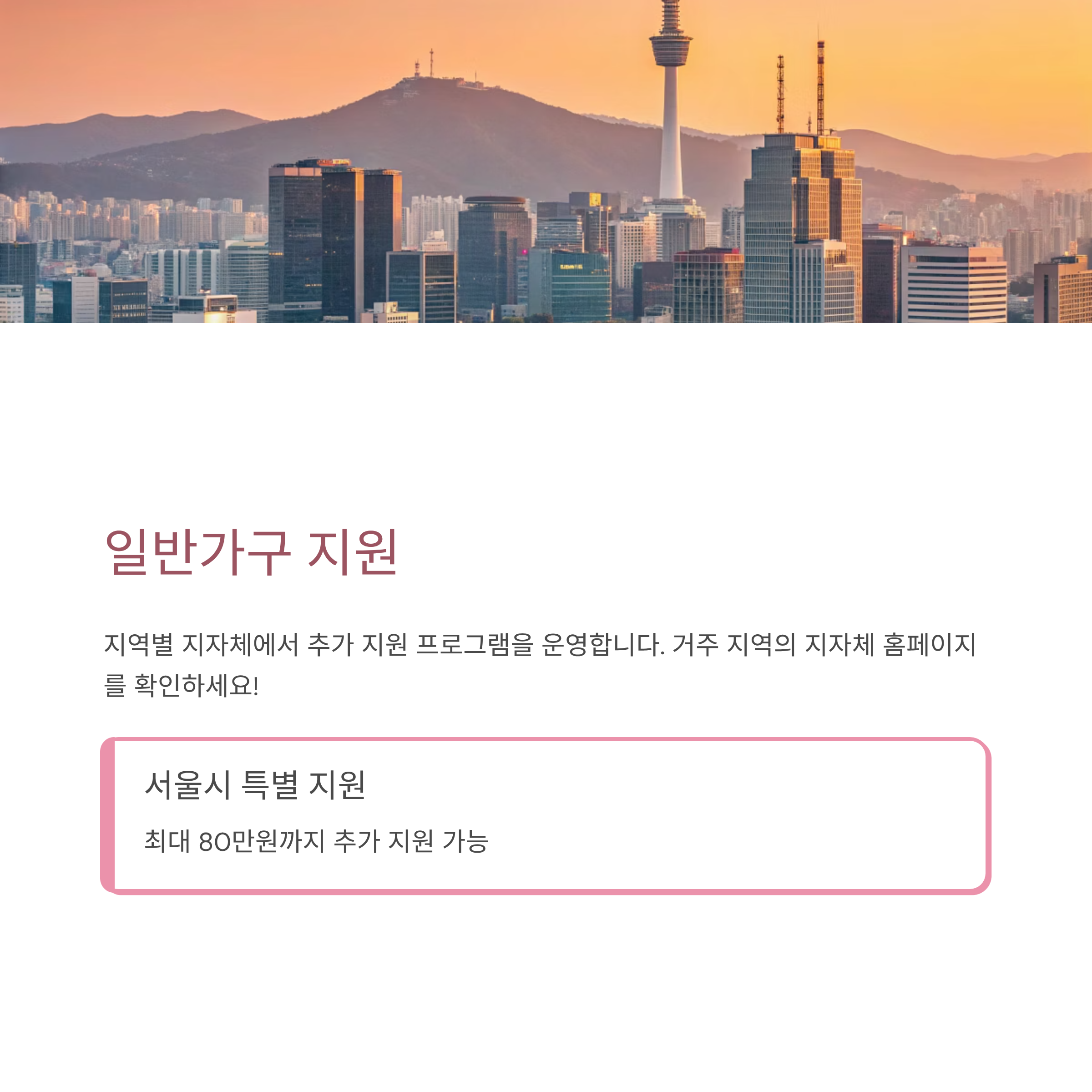 지역별 지자체에서 추가 지원 프로그램을 운영합니다. 서울시의 경우 최대 80만원까지 추가 지원합니다.