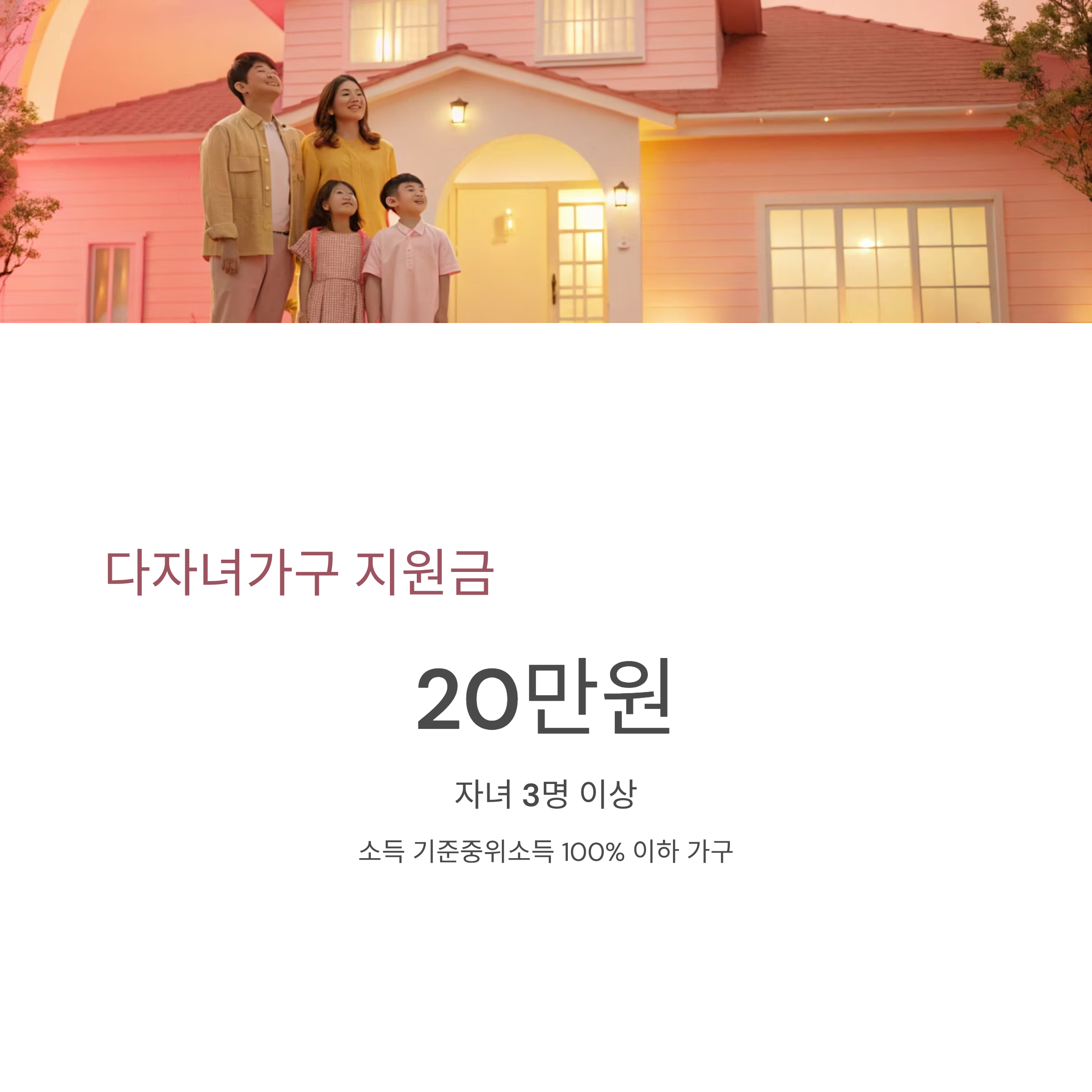 - 자녀 3명 이상 가구: 20만원 (소득 기준중위소득 100% 이하)