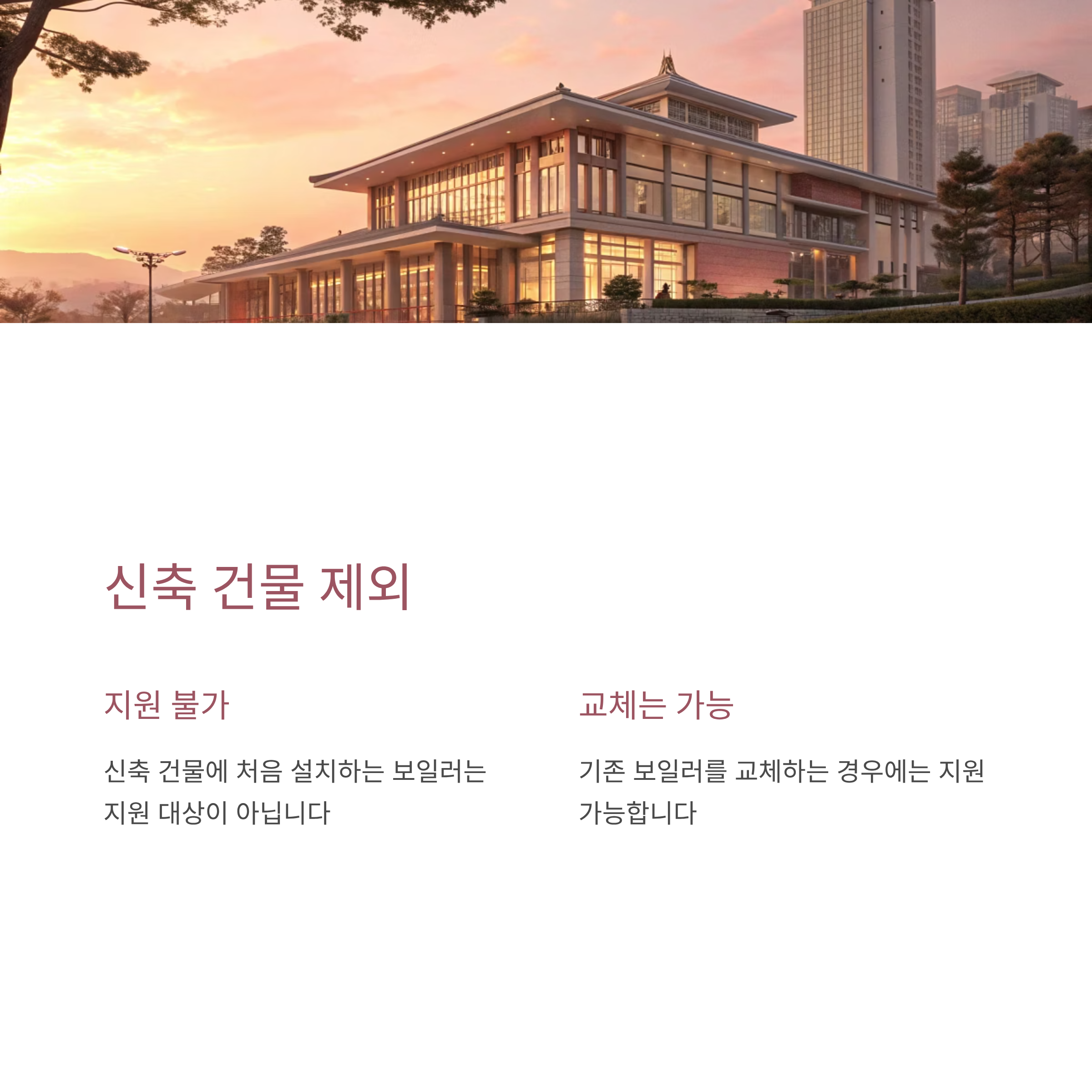 신축 건물에 처음 설치하는 보일러는 지원 대상이 아닙니다. 교체는 가능합니다.