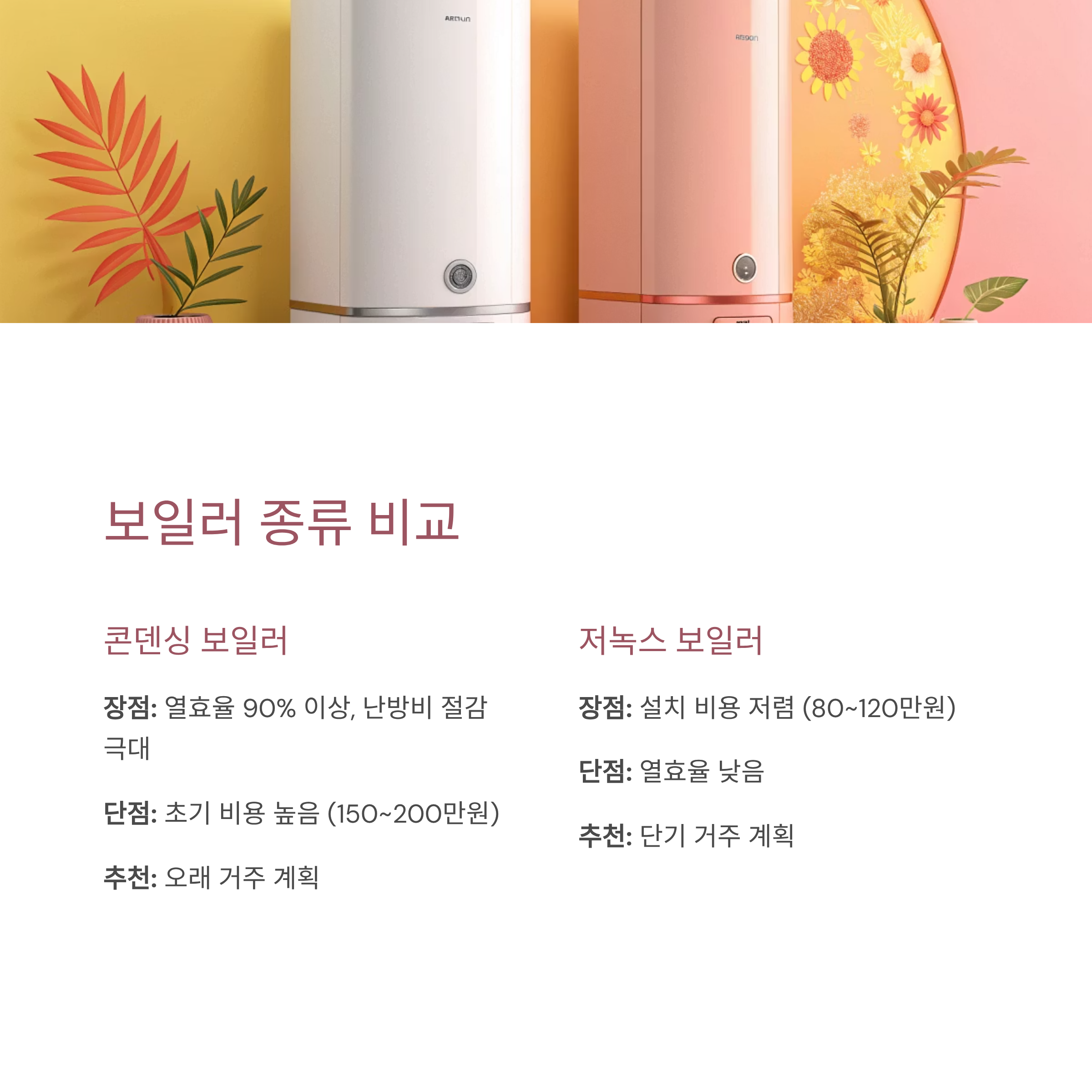 - 장점: 열효율이 매우 높음 (90% 이상), 난방비 절감 효과 극대