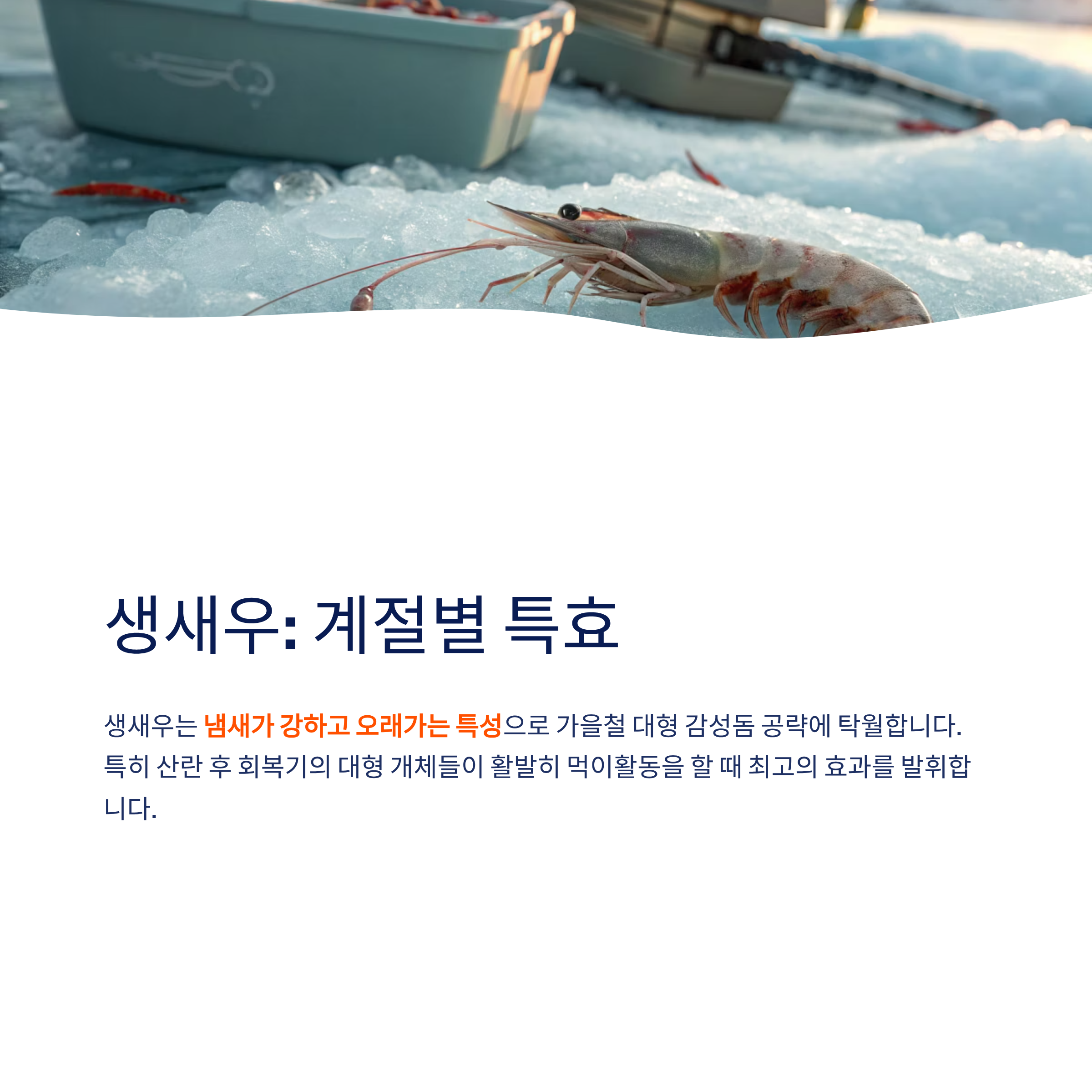 생새우는 냄새가 강하고 오래가는 특성으로 가을철 대형 감성돔 공략에 탁월합니다.