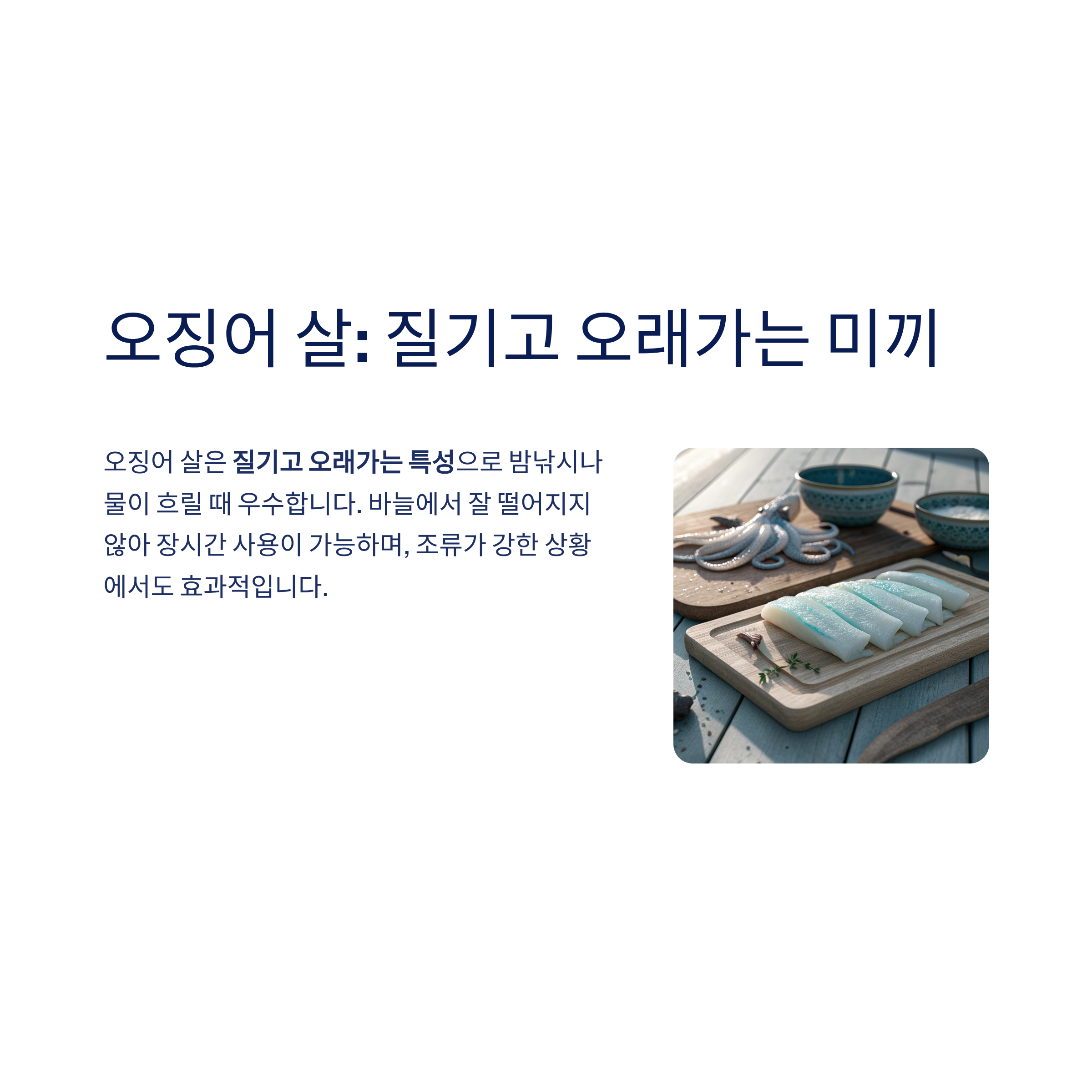 오징어 살은 질기고 오래가는 특성으로 밤낚시나 물이 흐릴 때 우수합니다.