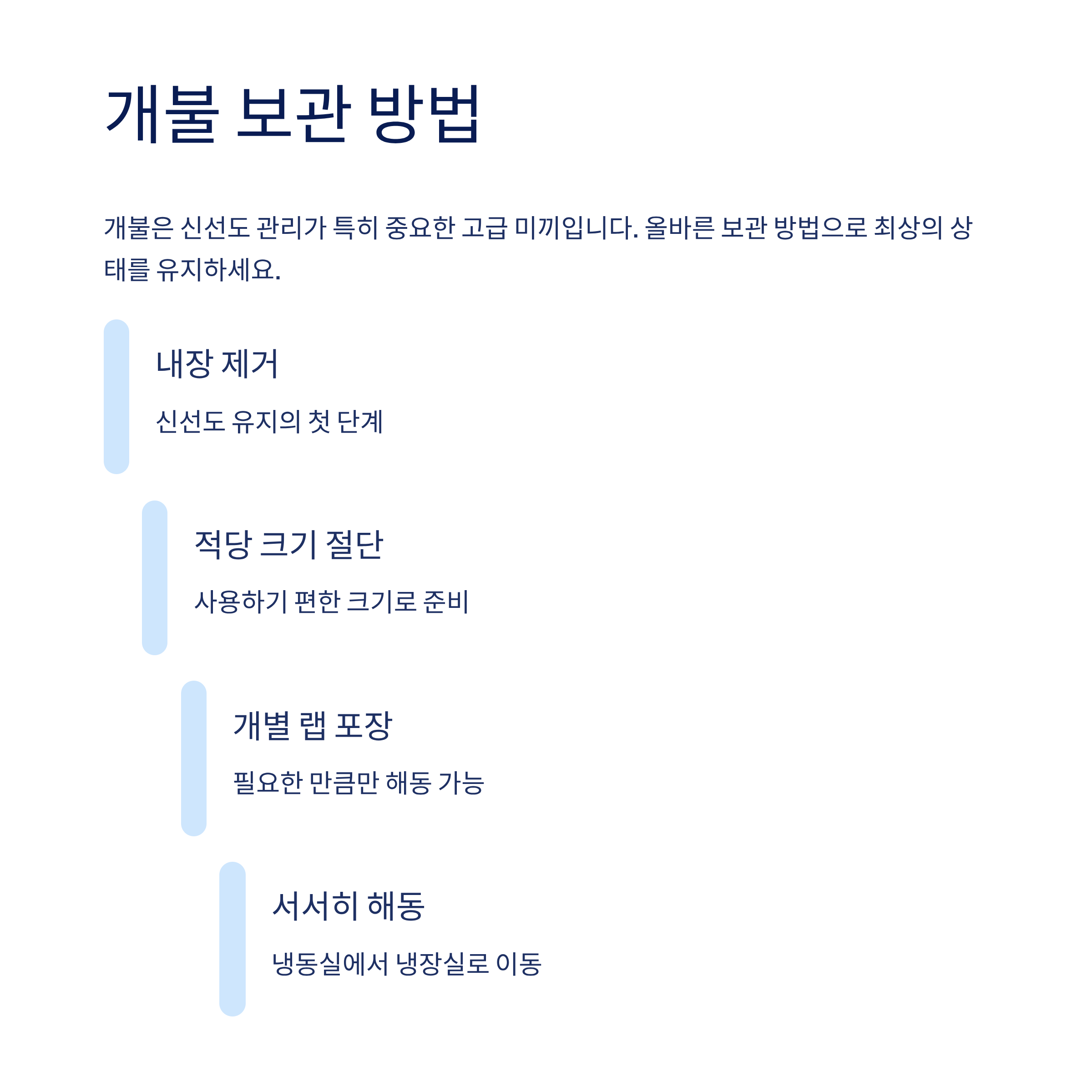 냉동 보관: 내장 제거 + 적당 크기 절단 + 개별 랩 포장