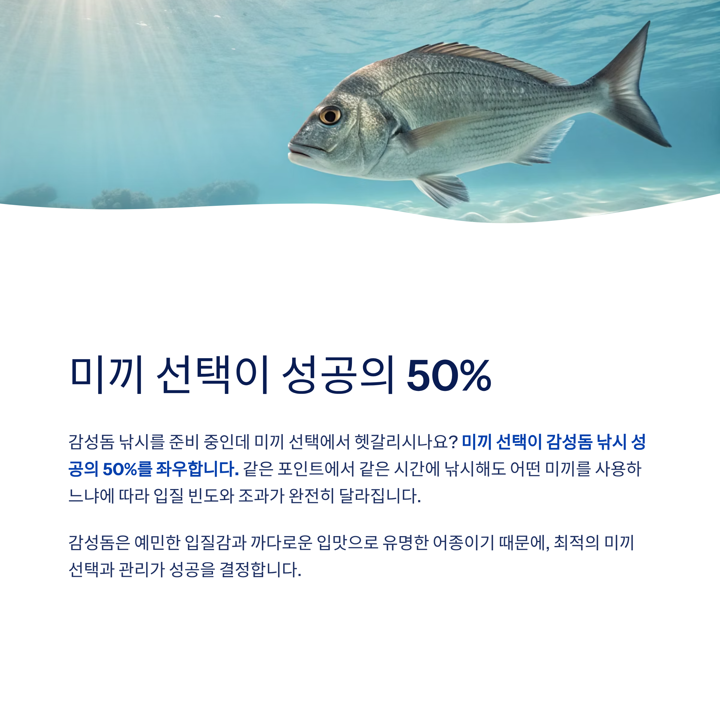 감성돔 낚시를 준비 중인데 미끼 선택에서 헷갈리시나요? **미끼 선택이 감성돔 낚시 성공의 50%**를 좌우한다는 사실을 아시나요? 같은 포인트에서 같은 시간에 낚시해도 어떤 미끼를 사용하느냐에 따라 입질 빈도와 조과가 완전히 달라집니다. 특히 감성돔은 예민한 입질감과 까다로운 입맛으로 유명한 어종이기 때문에, 최적의 미끼 선택과 관리가 성공을 결정합니다.